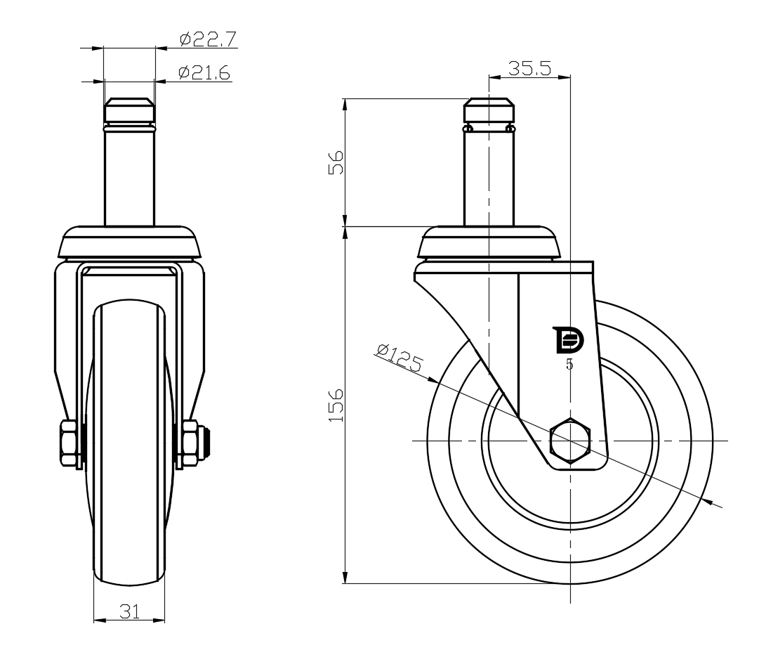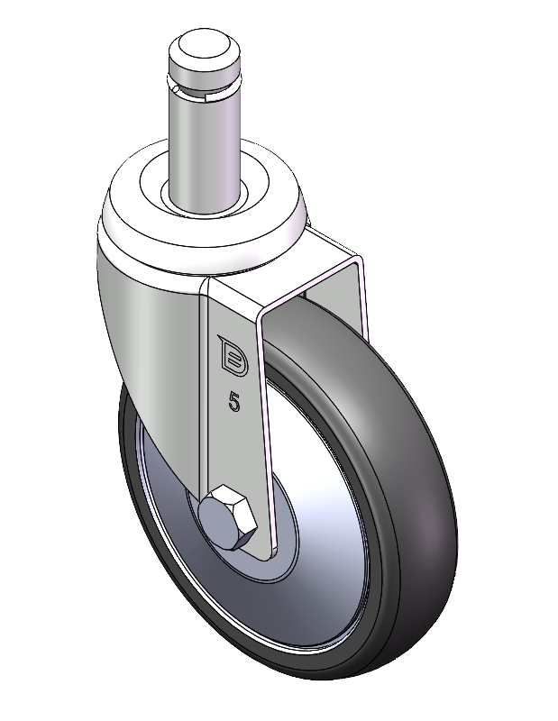 | Swivel Caster with Riveted Stamping Fork—Ø21.6 x 56L Zine-Plated, Mounting Type - Cylindrical Stem High-Quality Impact-Resistant Polypropylene core, High-Quality Reinforced Polypropylene Rubber (TPR) Wheel Tread Pearl-finish dark gray, Bearing—Ball Bearing. |   | |||||