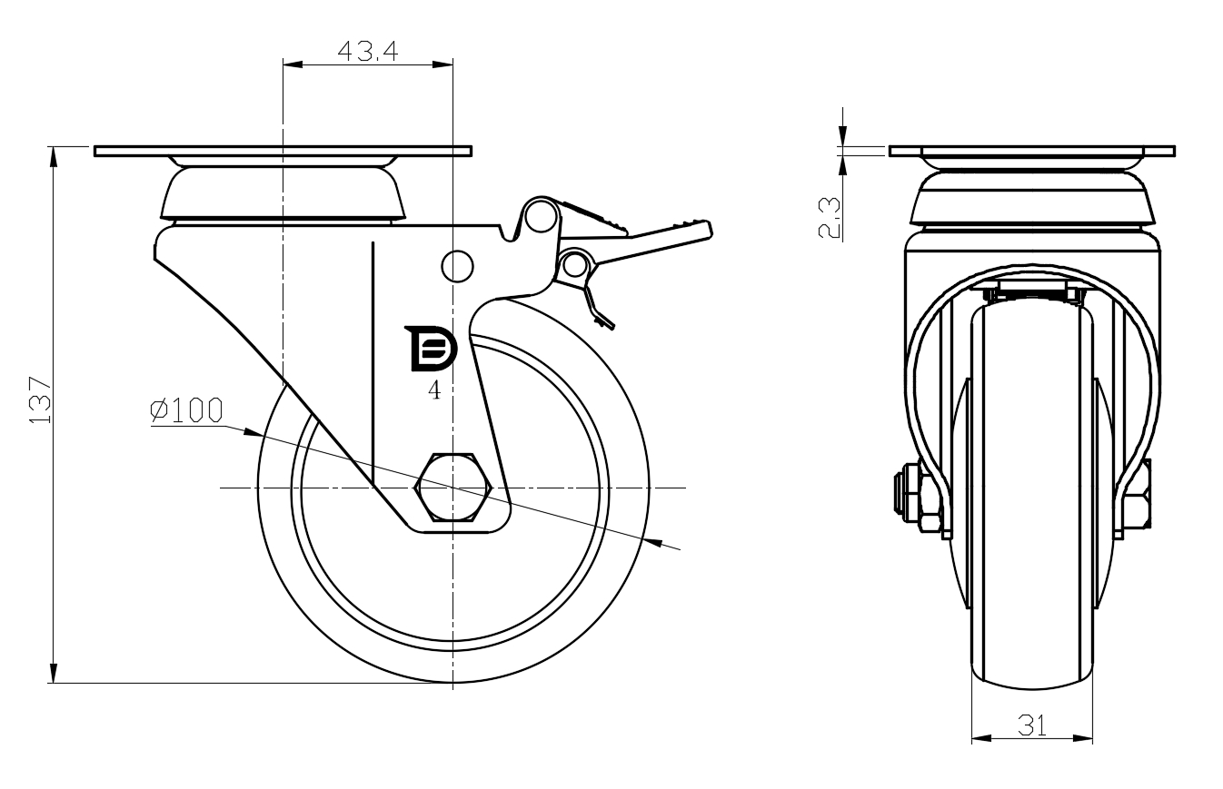 | Casters with Total Brakes and a With locking system. Top Plate Riveted and Stamping 72 x 53.5mm (2-7/8" x 2-1/8") Bolt Hole Spacing. Zine-Plated, Mounting Type - Top Plate. High-Quality Impact-Resistant Polypropylene Wheel Center with High-Quality Reinforced Polypropylene Rubber (TPR) Wheel Tread. Black-gray color, Bearing with Ball Bearings. |   | |||||