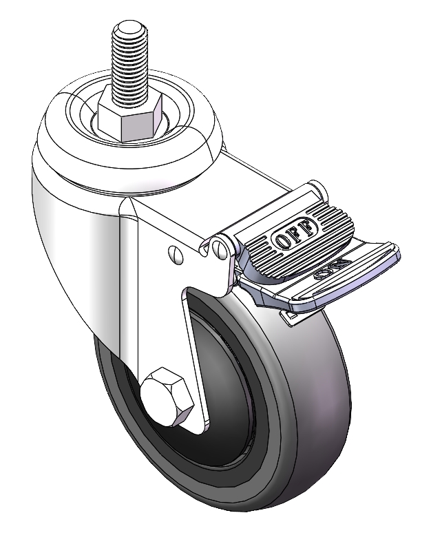 | Casters with a Total Brake and With locking system. Threaded Stem Riveted Pressed Fork—M12-P1.75. Zine-Plated, Mounting Type - Threaded Stem. High-Quality Impact-Resistant Polypropylene core, High-Quality Reinforced Polypropylene Rubber (TPR) Wheel Tread. Black-gray color, Bearing—Ball Bearings. |   | |||||