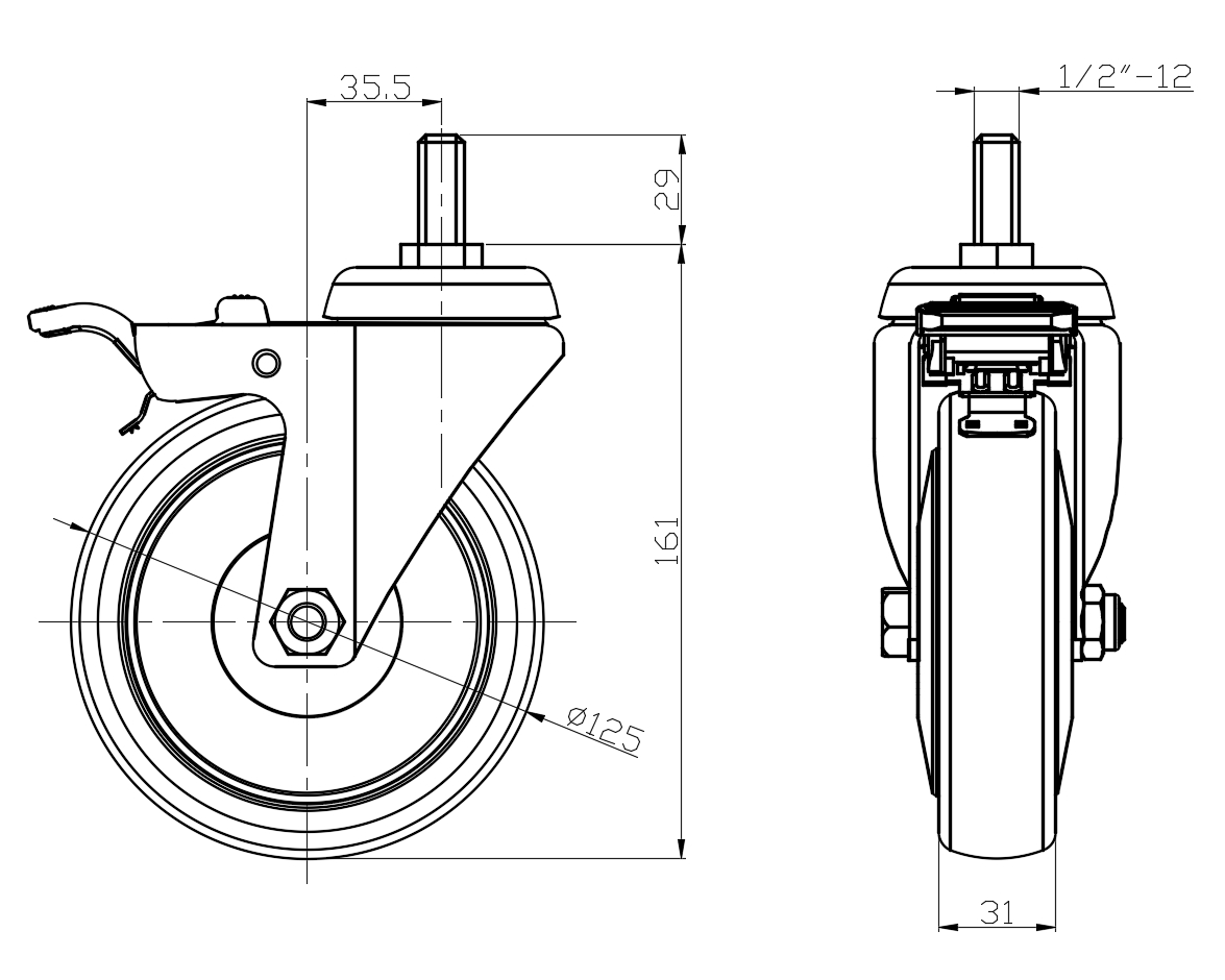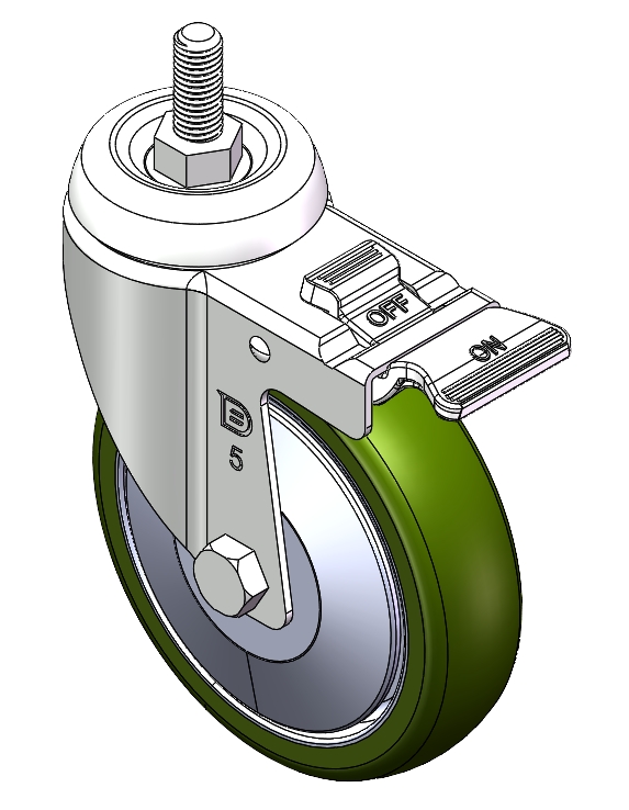 | Casters with Total Brakes and a With locking system. Threaded Stem Riveted Pressed Fork—1/2"-12" Zine-Plated, Mounting Type - Threaded Stem High-Quality Impact-Resistant Polypropylene Wheel Center, High Quality Polyurethane Wheel Tread Black-gray color, Bearing—Ball Bearings. |   | |||||