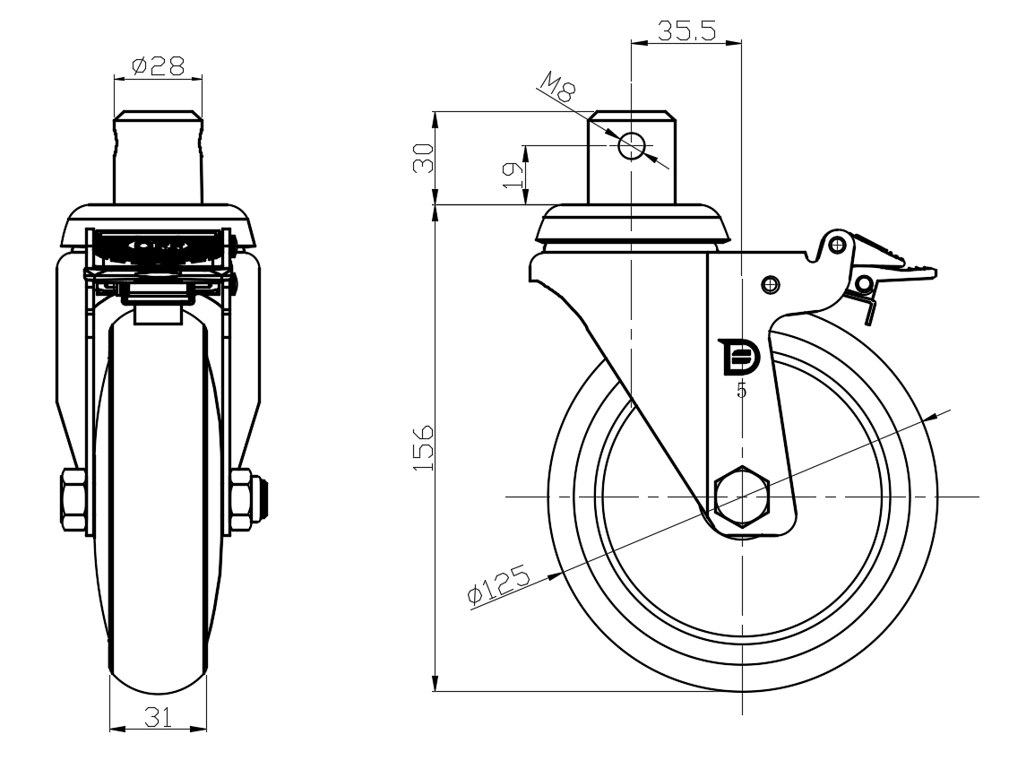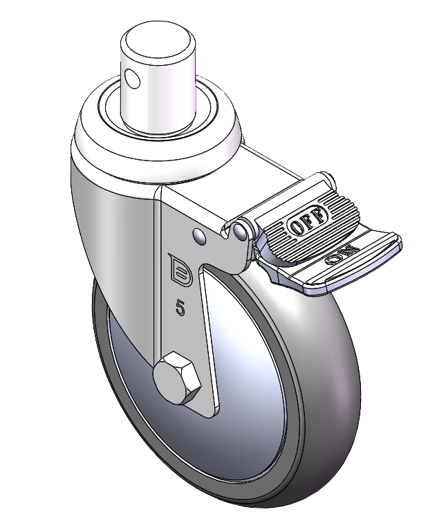 | Casters with a Total Brake and With locking system. Stamping, Riveted Fork—Ø28x30L Chrome-Plated finish, stud-type Mounting Type mechanism, M8 hole Aluminum core, High Quality Polyurethane Wheel Tread Gray, Bearing—Ball Bearings. |   | |||||