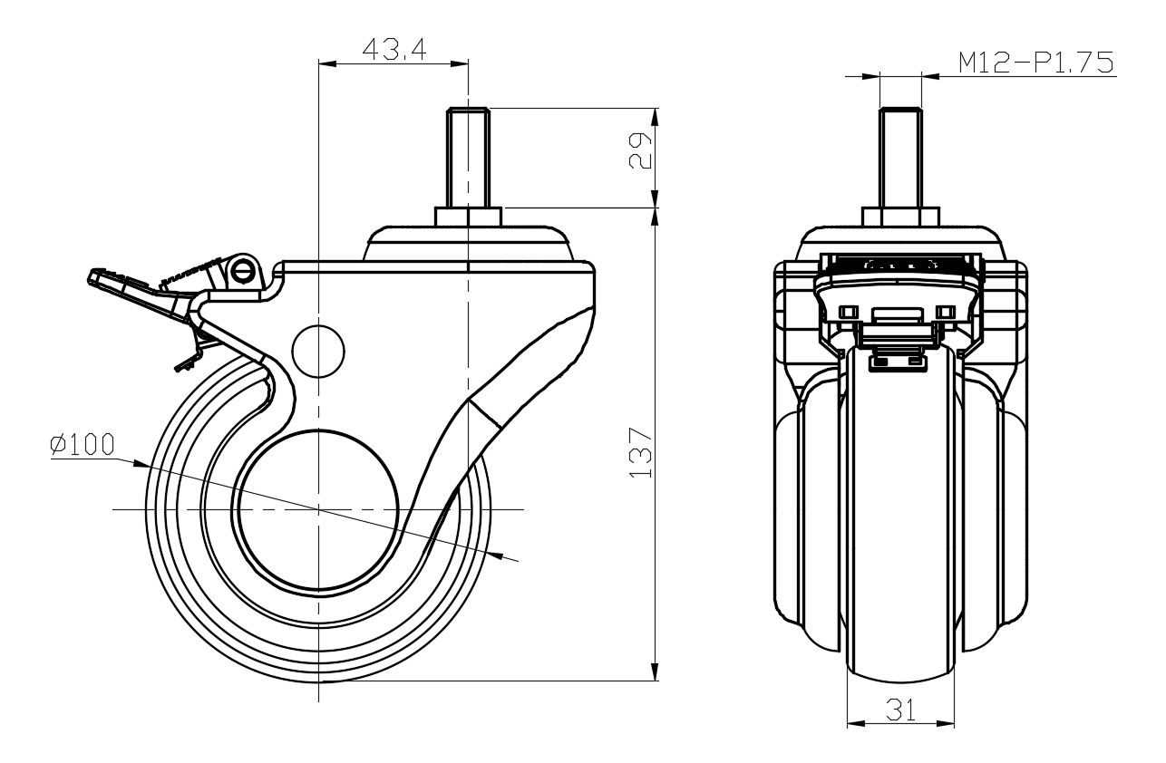 Casters with a Total Brake and With locking system. UNC-Riveted Stamping bracket—M12-