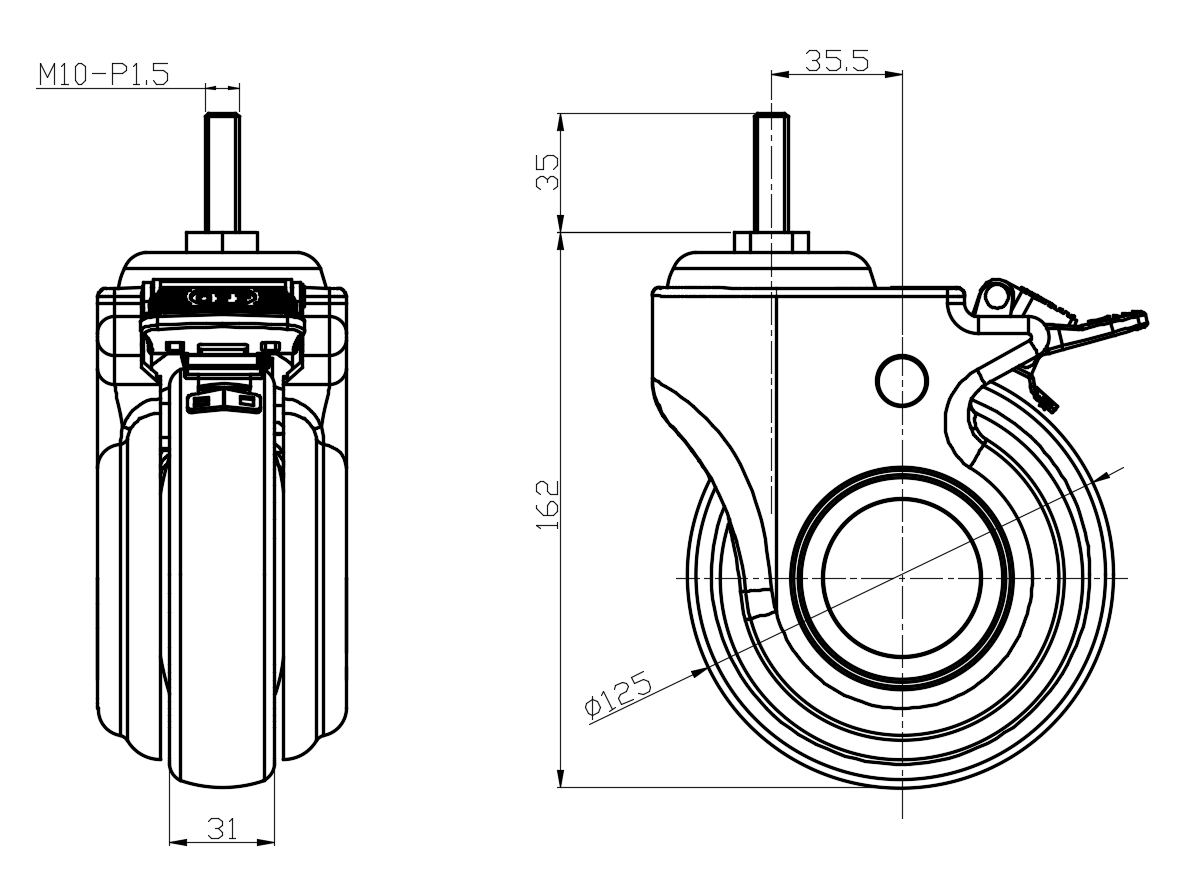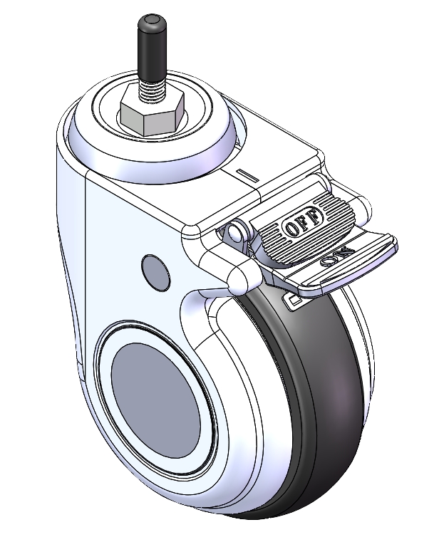 | Casters with a Total Brake and With locking system. Threaded Stem Riveted Pressed Fork—M10-P1.5. Zine-Plated, Mounting Type - Threaded Stem with thread protector. High-Quality Impact-Resistant Polypropylene Wheel Center with High-Quality Reinforced Polypropylene Rubber (TPR) Wheel Tread. Pearl-gray finish. Bearings—Ball Bearings. |   | |||||
