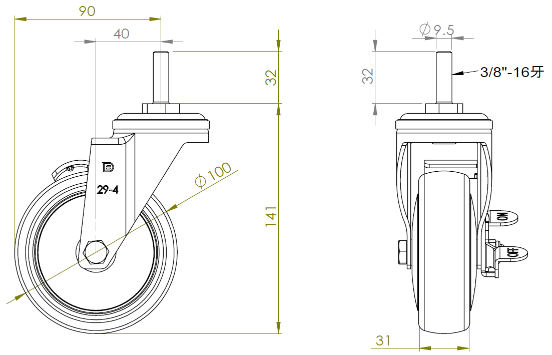 | 配有側(輪)煞式,鎖定系統的腳輪。