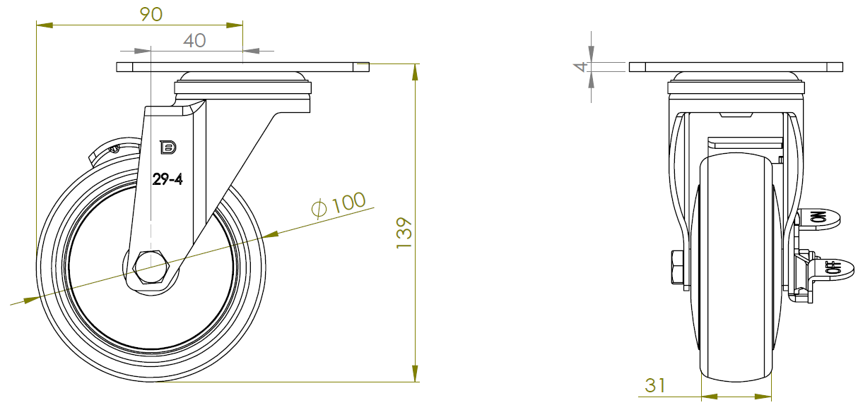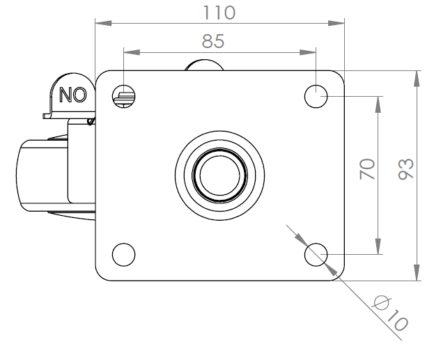 | 配有側(輪)煞式,鎖定系統的腳輪。底板鉚合沖壓腳架—圓孔 表面電鍍,底板式(4T)安裝裝置 耐衝擊聚丙烯輪芯,熱塑性彈性體(TPR)輪面 深灰色,輪子軸承—精密滾珠。 |