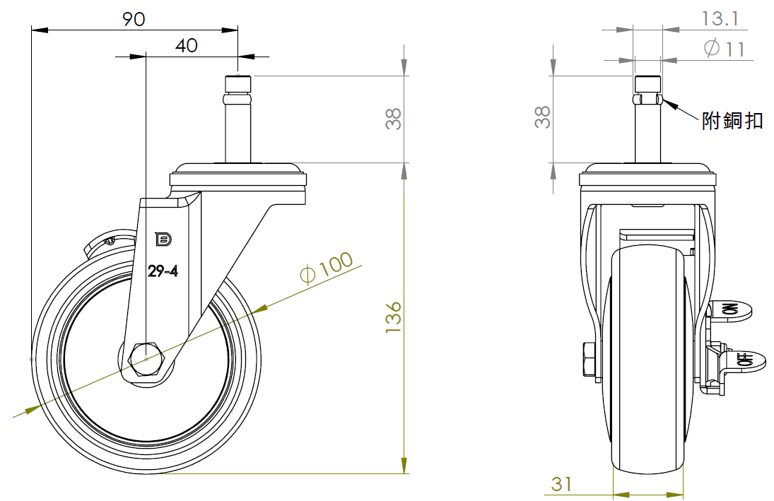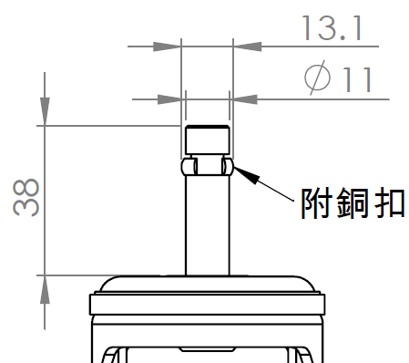 | 配有側(輪)煞式,鎖定系統的腳輪。插心鉚合沖壓腳架— Ø11x38L 表面鍍鋅,插心式安裝裝置,附銅扣 耐衝擊聚丙烯輪芯,熱塑性彈性體(TPR)輪面 深灰色,輪子軸承—精密滾珠。 |