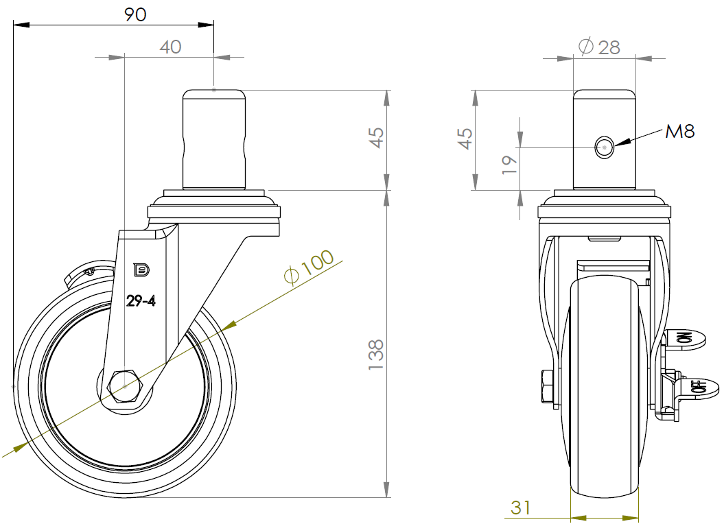 | 配有側(輪)煞式,鎖定係統的腳輪。插心鉚合沖壓腳架— Ø28x45L 表面鍍鋅,插心式安裝裝置 耐衝擊聚丙烯輪芯,熱塑性彈性體(TPR)輪面 深灰色,輪子—中管式。 |