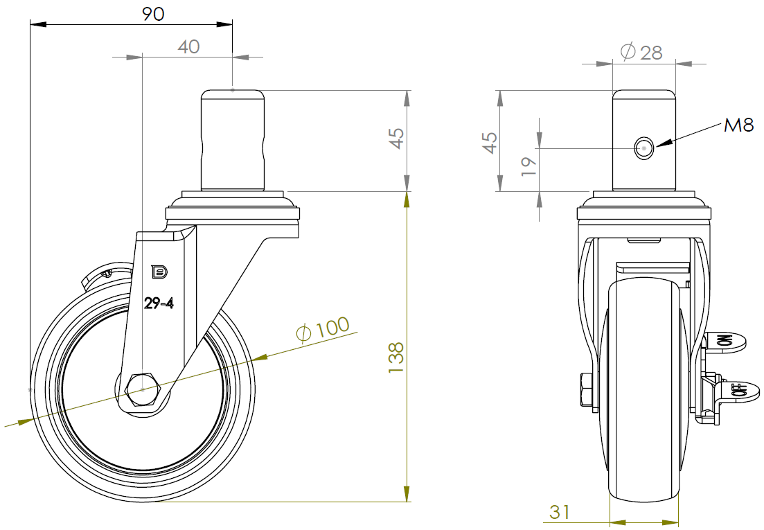 | 配有側(輪)煞式,鎖定係統的腳輪。插心鉚合沖壓腳架— Ø28x45L 表面鍍鋅,插心式安裝裝置 耐衝擊聚丙烯輪芯,熱塑性彈性體(TPR)輪面 深灰色,輪子軸承—精密滾珠。 |