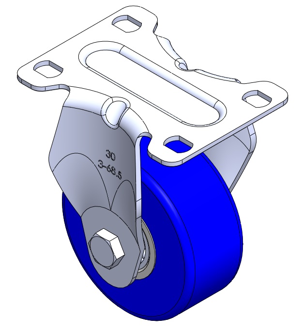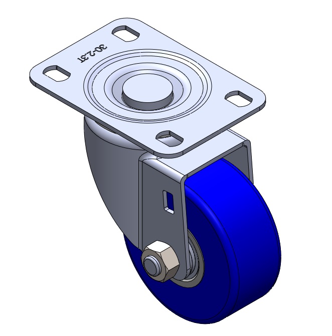 | Rigid Caster with Stamping Fabricated Caster Fork and 75 x 45 mm (3" x 1-3/4") Bolt Hole Spacing. Zine-Plated, Mounting Type - Top Plate. Cast Iron core with High Quality Polyurethane Wheel Tread. Blue color. Bearings: Ball Bearings. |