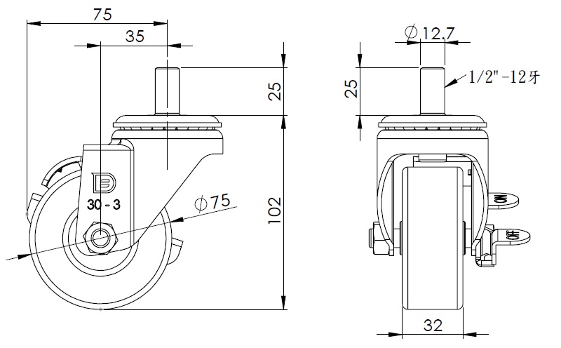 Threaded Stem 1/2"-12牙 Threaded Size 25mm Offset 35mm Swivel Interference 150mm Overall Height 102mm Swivel Radius 75mm Hardness Of Tread 93±5° Shore A Load Capacity (Dynamic) 180kgs |