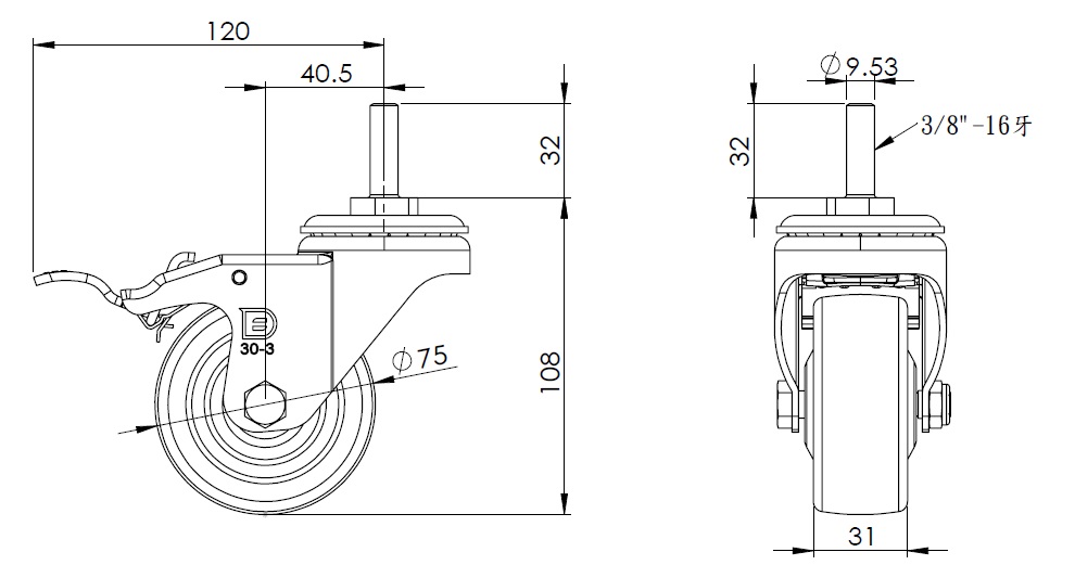 Threaded Stem 3/8"-16牙 Threaded Length 32mm Offset 40.5mm Swivel Interference 240mm Overall Height 108mm Swivel Radius 120mm Hardness Of Tread 80±5° Shore A Load Capacity (Dynamic) 90kgs |