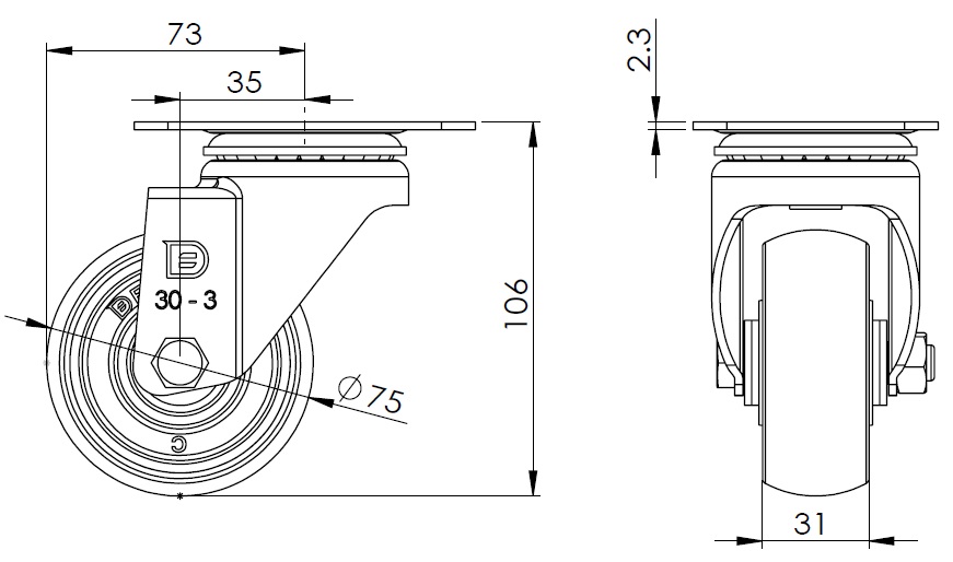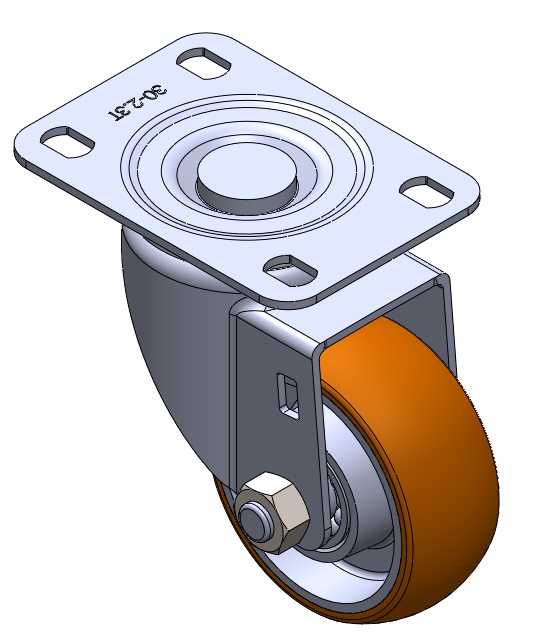 | Swivel Caster with Riveted Fork and Stamping Fork – 75 x 45 mm (3" x 1-3/4") Bolt Hole Spacing Zine-Plated, Top Plateed Mounting Type Aluminum core with High Quality Polyurethane Wheel Tread Brown, Bearing – Ball Bearings. |