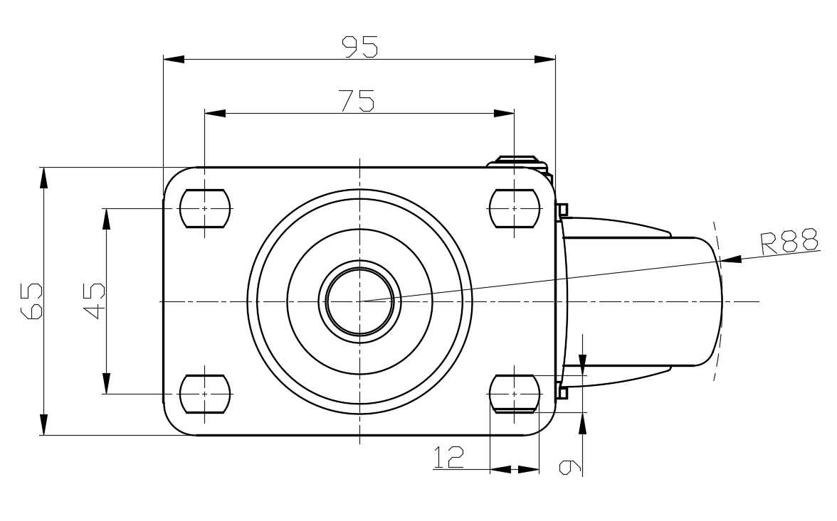 表面镀锌,底板式(4T)安装装置 耐冲击聚丙烯轮芯,热塑性弹性体(TPR)轮面 黑灰色,轮子轴承 — 精密滚珠。 |