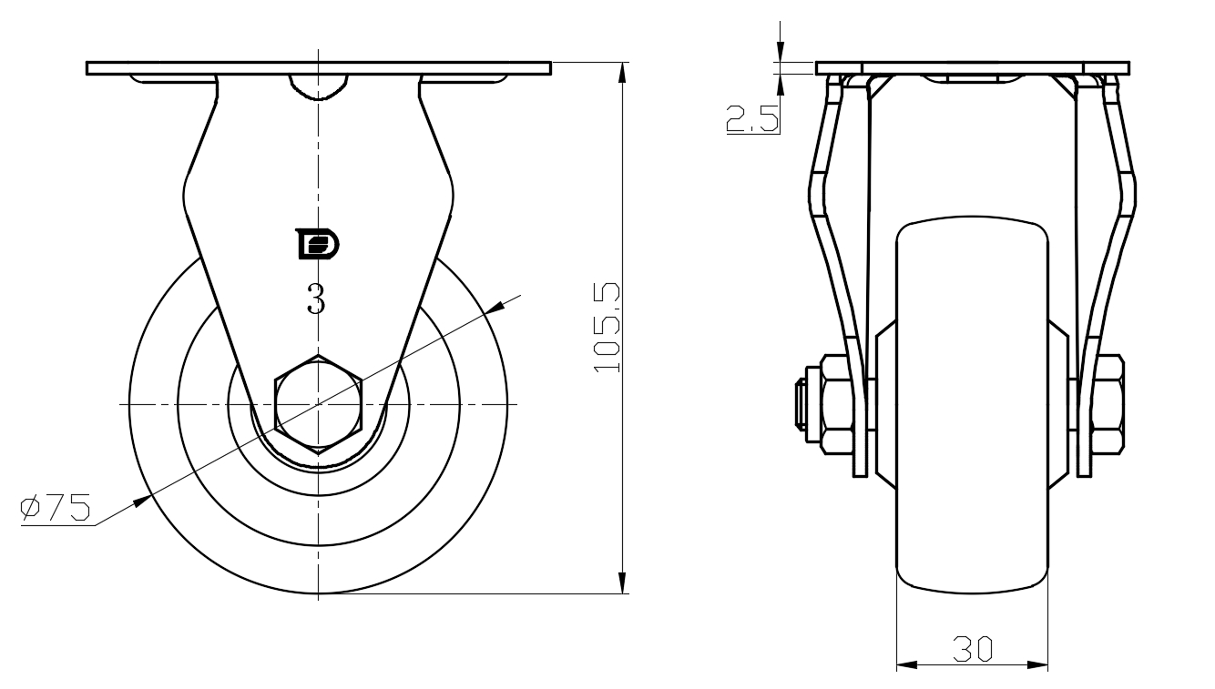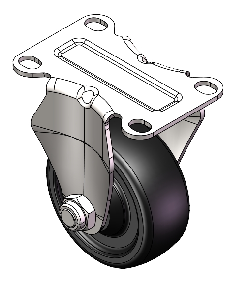 | Rigid castors, Stamping Fabricated Caster Fork - 75 x 45 mm (3" x 1-3/4") Bolt Hole Spacings Extended control lever surface, Top Plate installation Reinforced Polypropylene, High-Quality Resilient Rubber Wheel Tread Wheels—Plain Bearing |