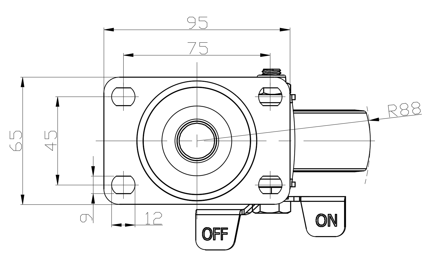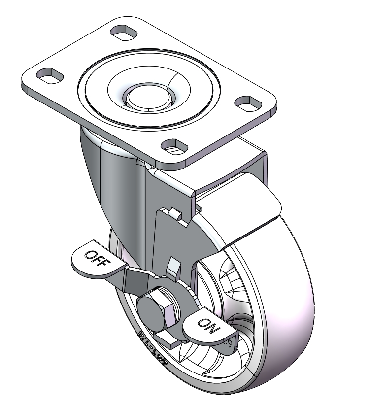 Casters with Side Brakes and With locking system. Top Plate Riveted and Stamping with 75 x 45 mm (3" x 1-3/4") Bolt Hole Spacing.