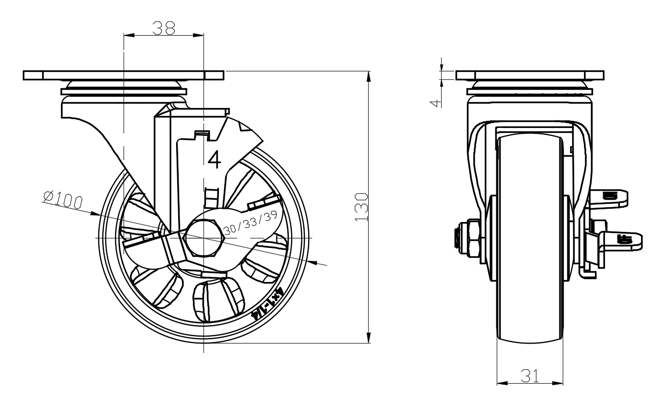 | Wheel tread: Thermoplastic (PA6) Wheel Center: Thermoplastic (PA6) Drawings are for reference only and may differ from the product |