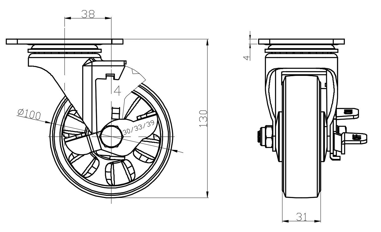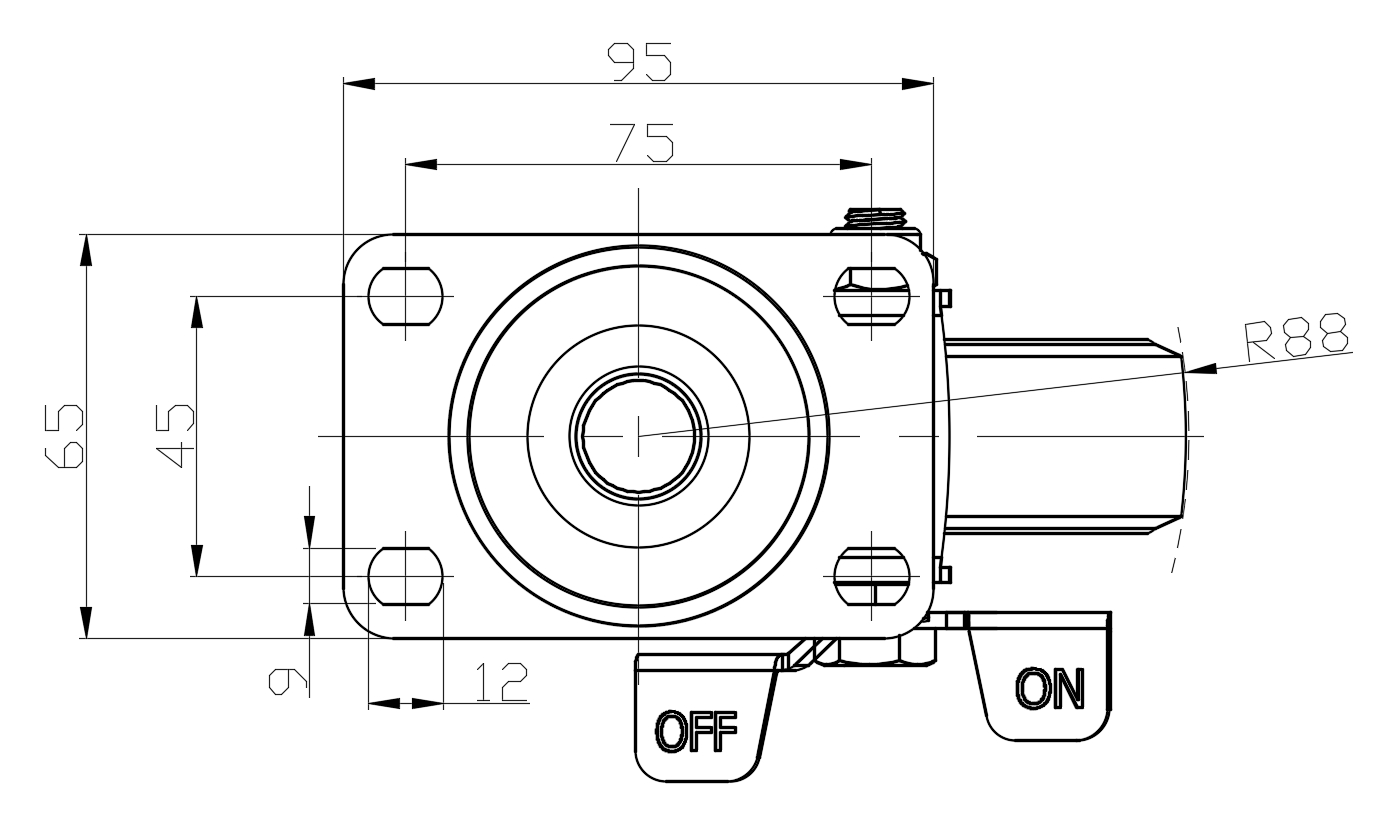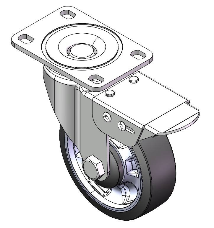 Casters with Side Brakes and With locking system. Top Plate with Riveted Fork and 75 x 45 mm (3" x 1-3/4") Bolt Hole Spacing.