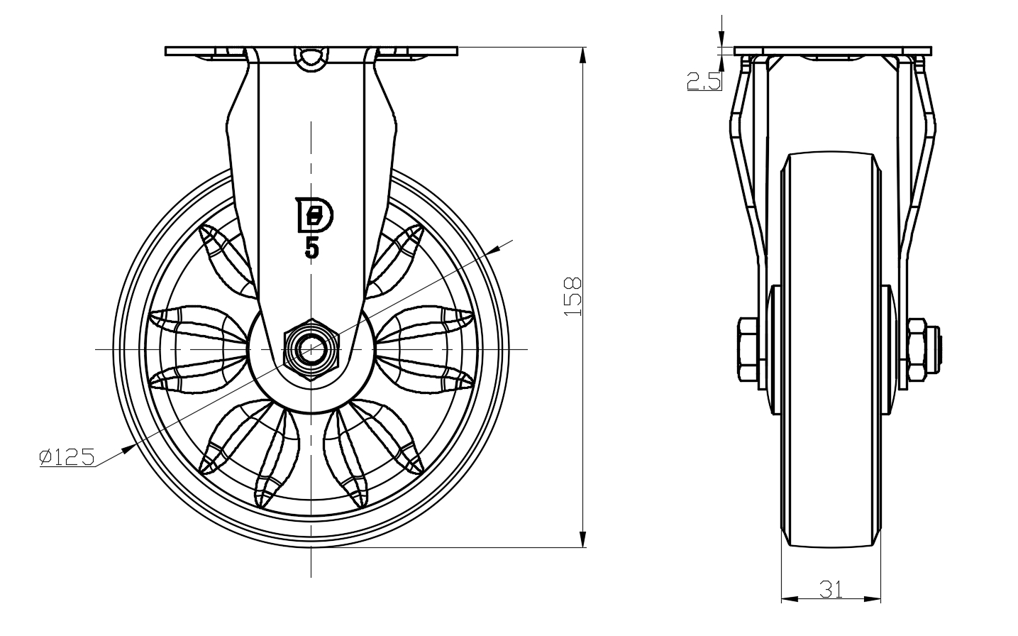 Rigid Caster with Stamping Fabricated Caster Fork and 75 x 45 mm (3" x 1-3/4") Bolt Hole Spacing.