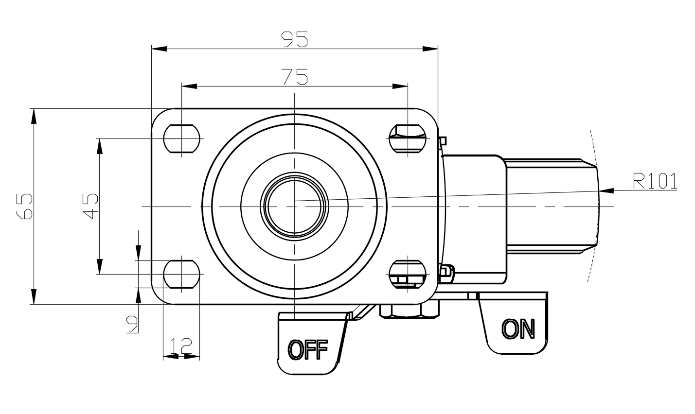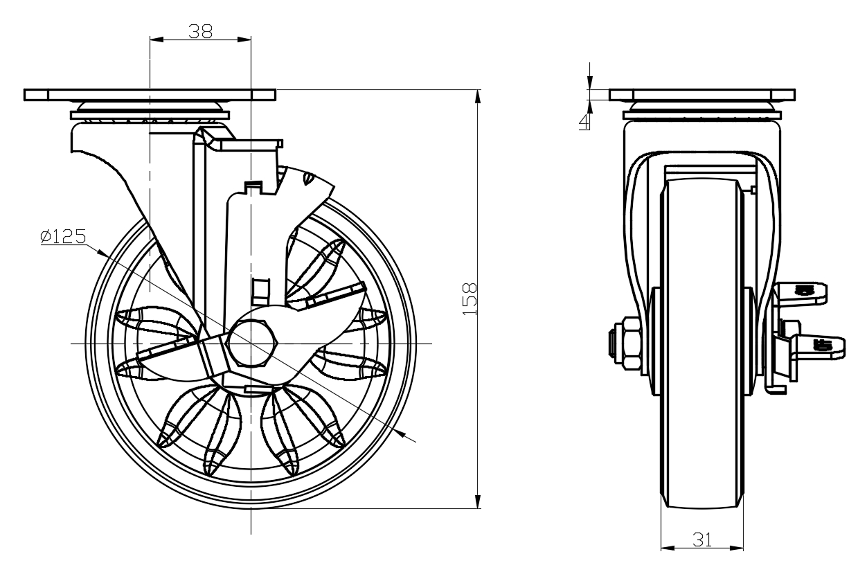 Casters with Side Brakes and With locking system. Top Plate with Riveted Fork and 75 x 45 mm (3" x 1-3/4") Bolt Hole Spacing.