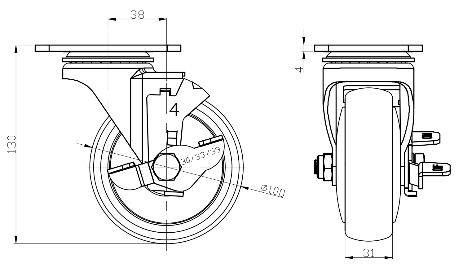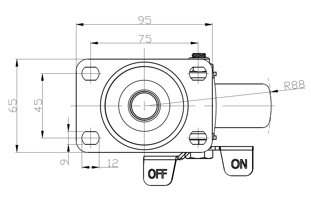 Casters with Side Brakes and With locking system. Top Plate with Riveted Fork and 75 x 45 mm (3" x 1-3/4") Bolt Hole Spacing.