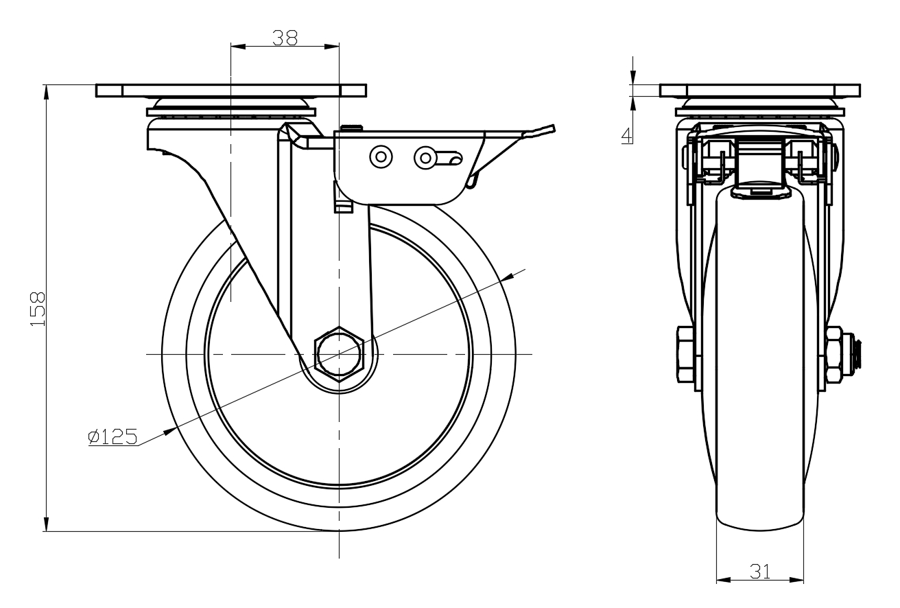 Casters with a Total Brake and With locking system. Top Plate Riveted and Stamping with 75 x 45 mm (3" x 1-3/4") Bolt Hole Spacing.