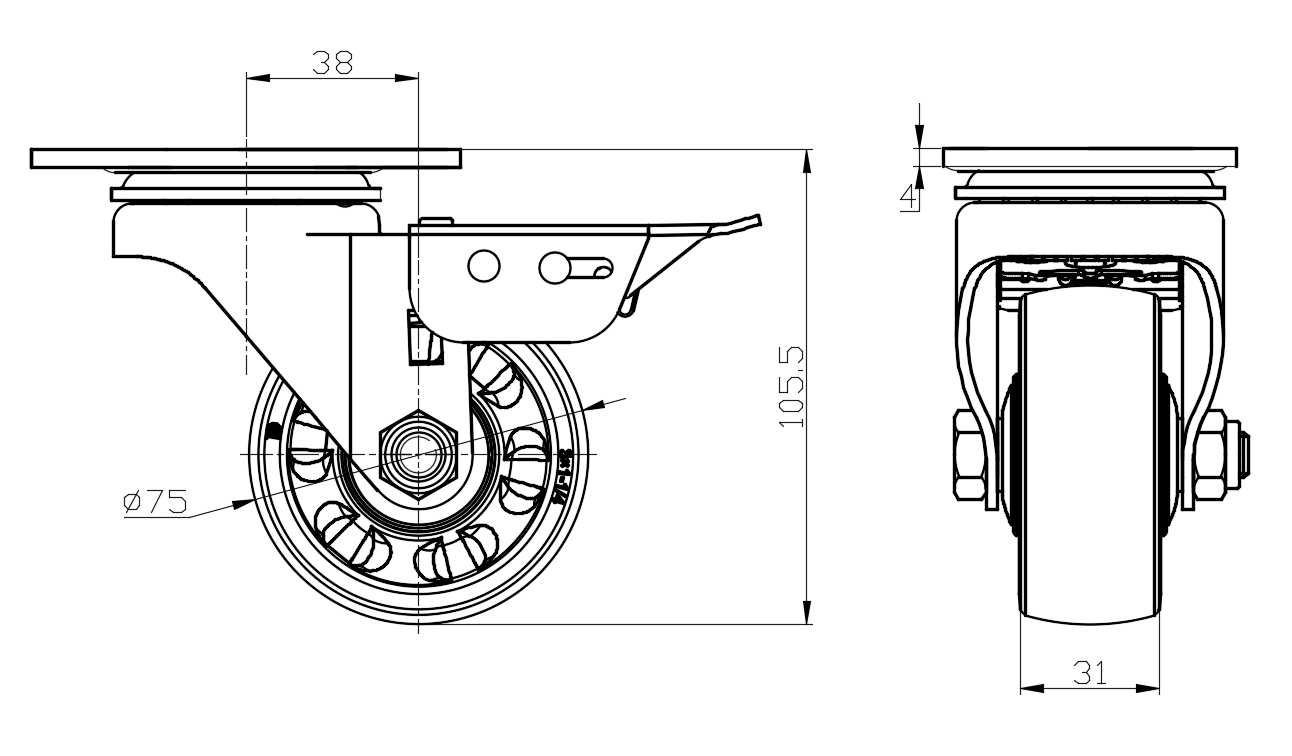Casters with Total Brakes and With locking system. Top Plate with Riveted, Stamping Fork—75 x 45 mm (3" x 1-3/4") Bolt Hole Spacing.