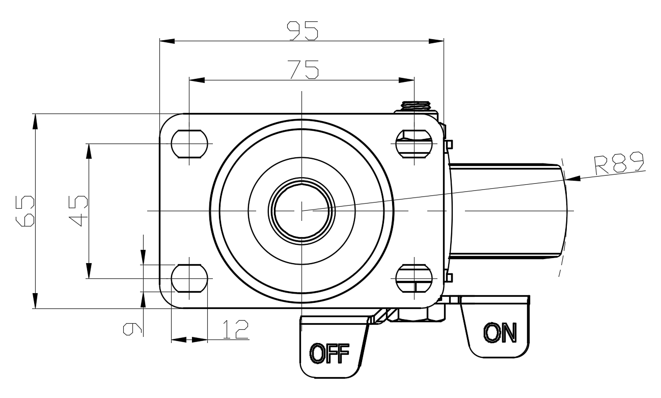 Casters with Side Brakes and With locking system. Top Plate with Riveted, Fork—75 x 45 mm (3" x 1-3/4") Bolt Hole Spacing.