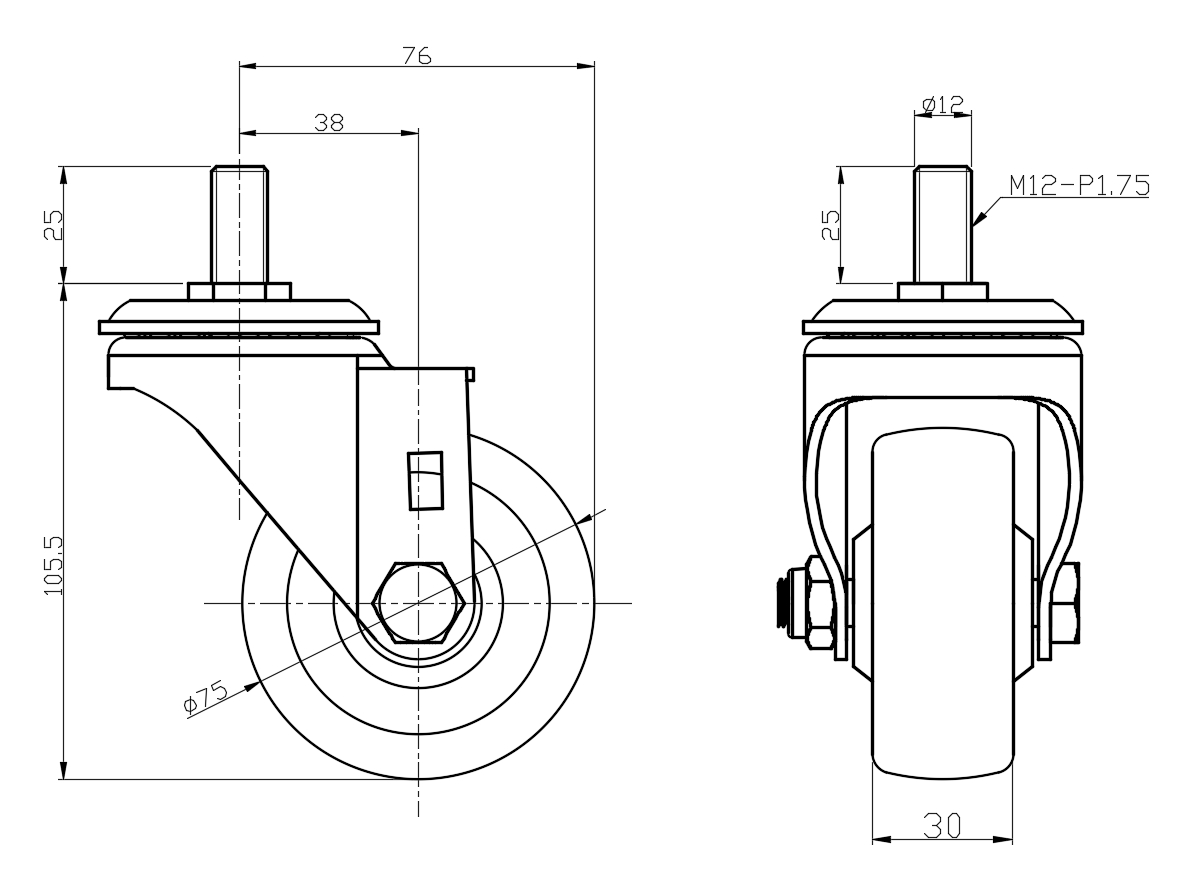 Swivel Caster, thread-Riveted Stamping Fork—M12-P1.75