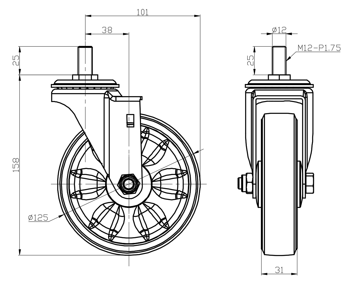 Swivel Caster, thread-Riveted Stamping Fork—M12-P1.75