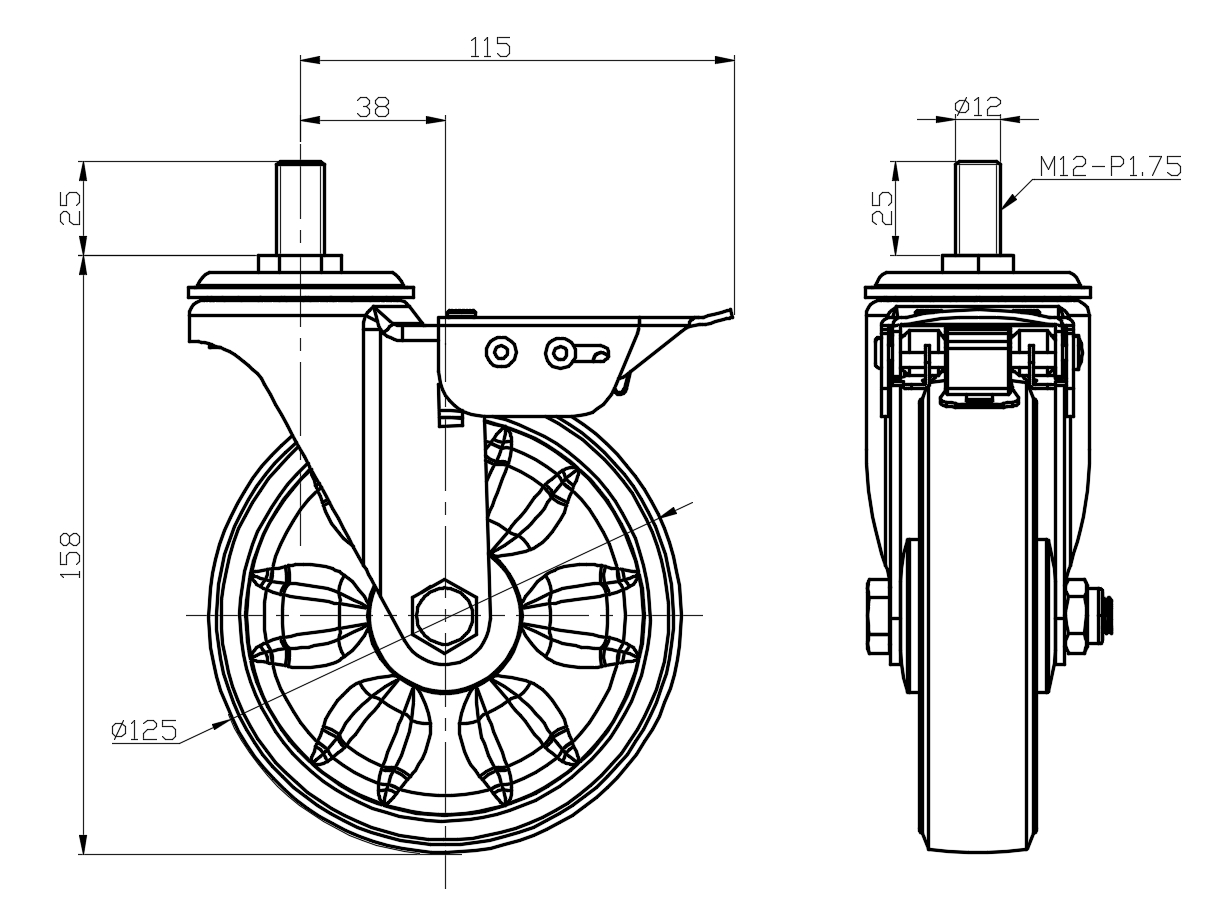 Casters with Total Brakes and a With locking system. Threaded Stem Riveted Pressed Fork—M12-P1.75.
