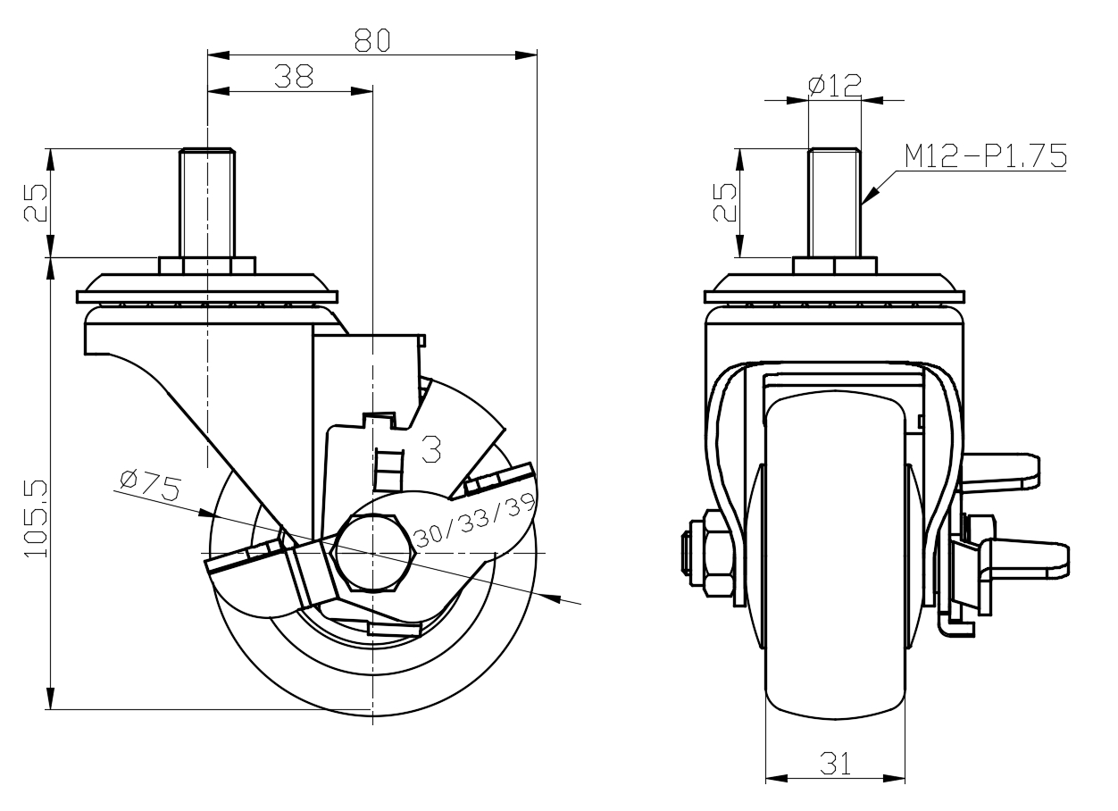 Casters with Side Brakes and With locking system. Threaded Stem Riveted Pressed Fork – M12-P1.75