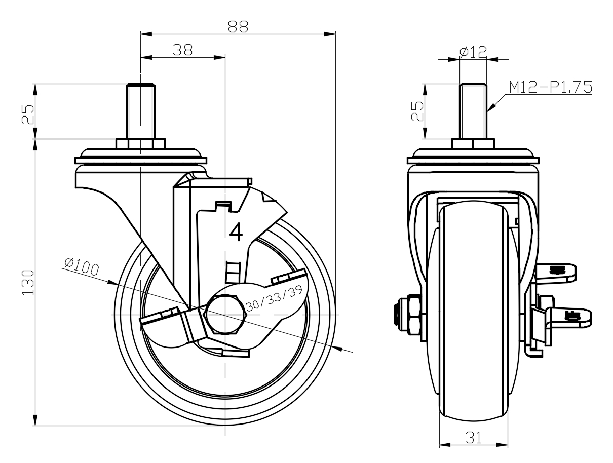 Casters with Side Brakes and With locking system. Threaded Stem Riveted Pressed Fork—M12-P1.75.