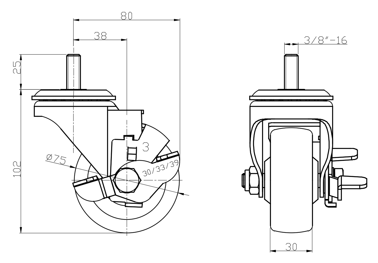Casters with Side Brakes and With locking system. Threaded Stem Riveted Pressed Fork—3/8"-16"