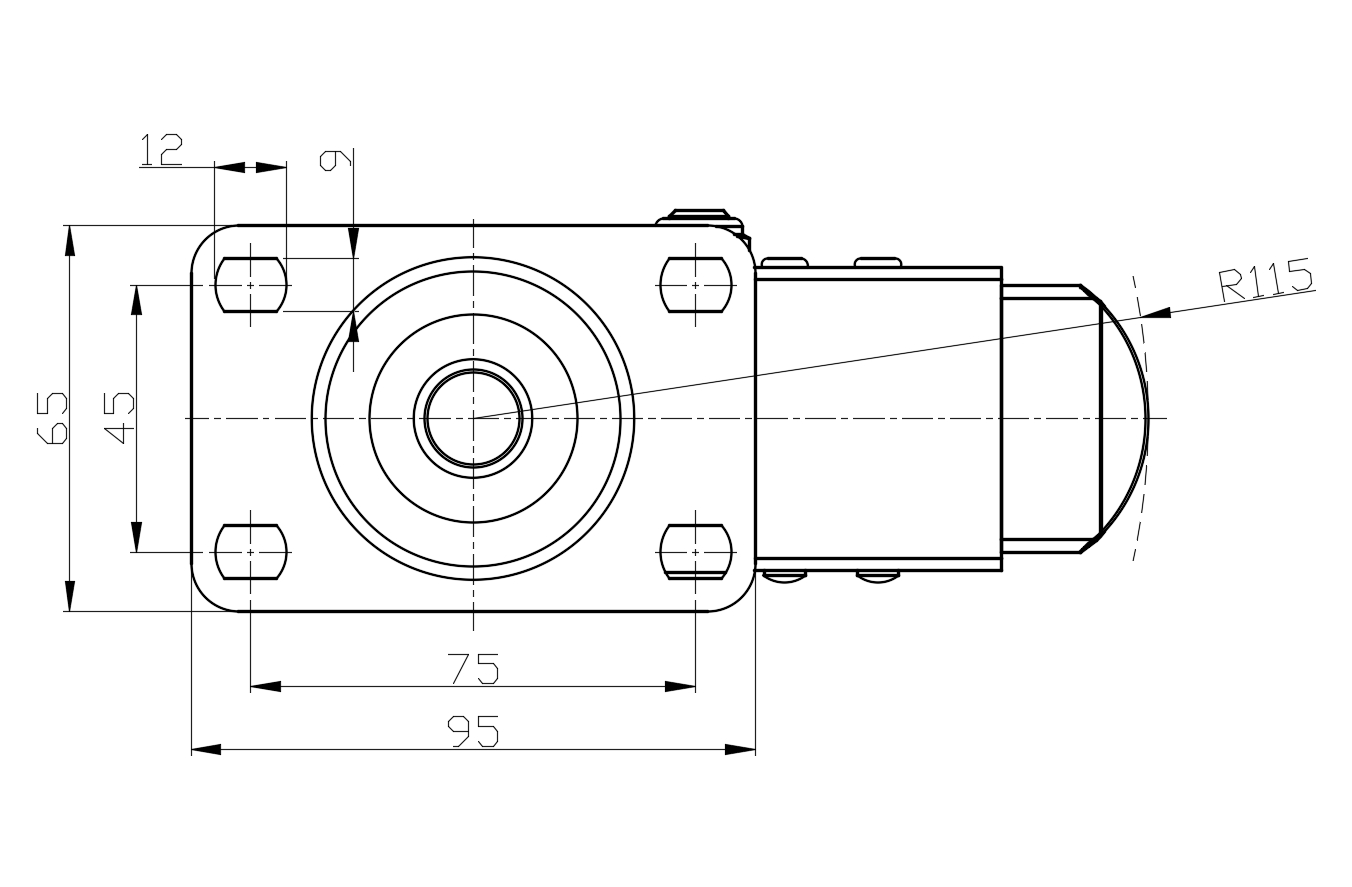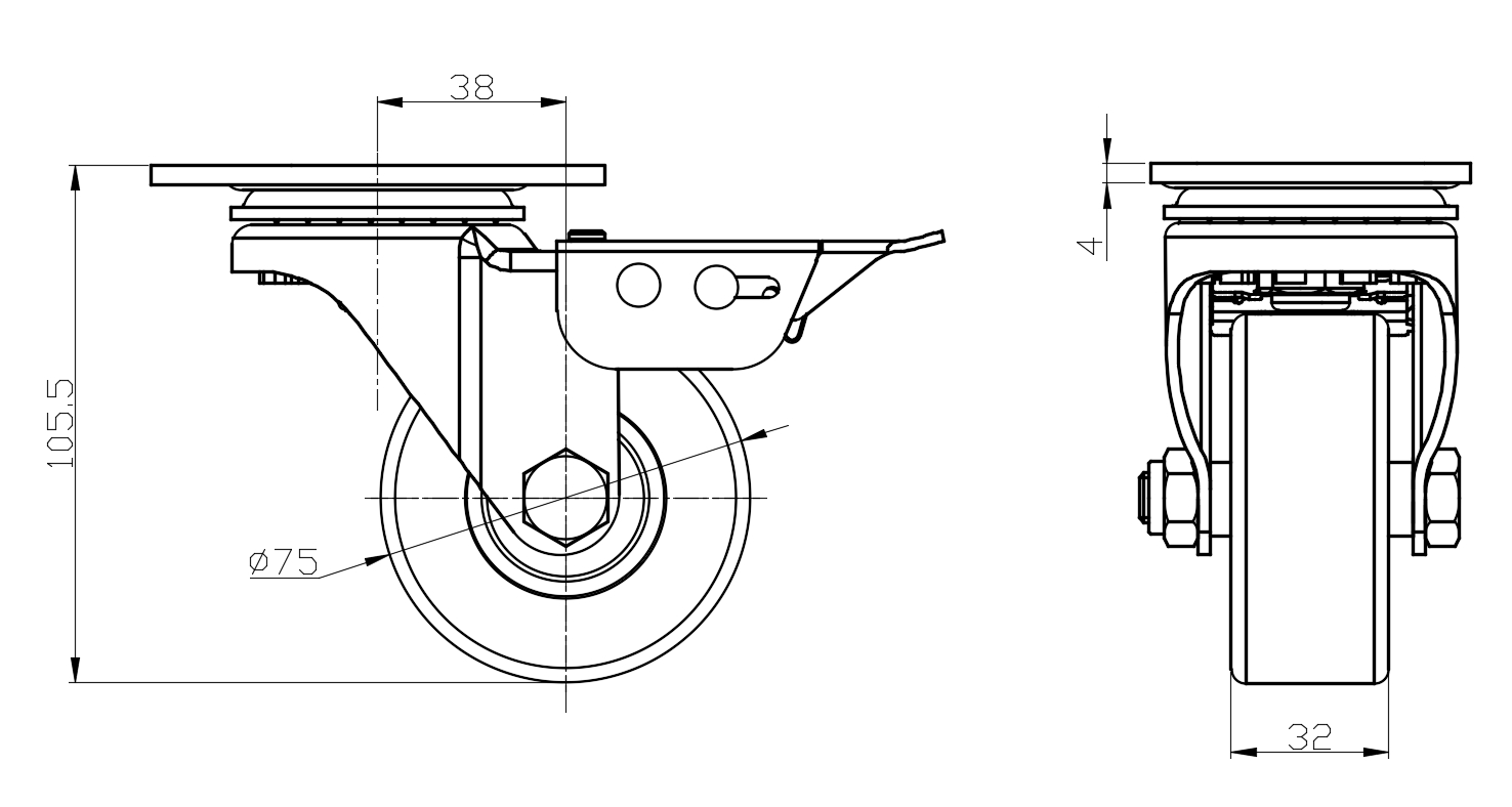 Casters with Total Brakes and a With locking system. Top Plate with Riveted, Stamping Fork and 75 x 45 mm (3" x 1-3/4") Bolt Hole Spacing.