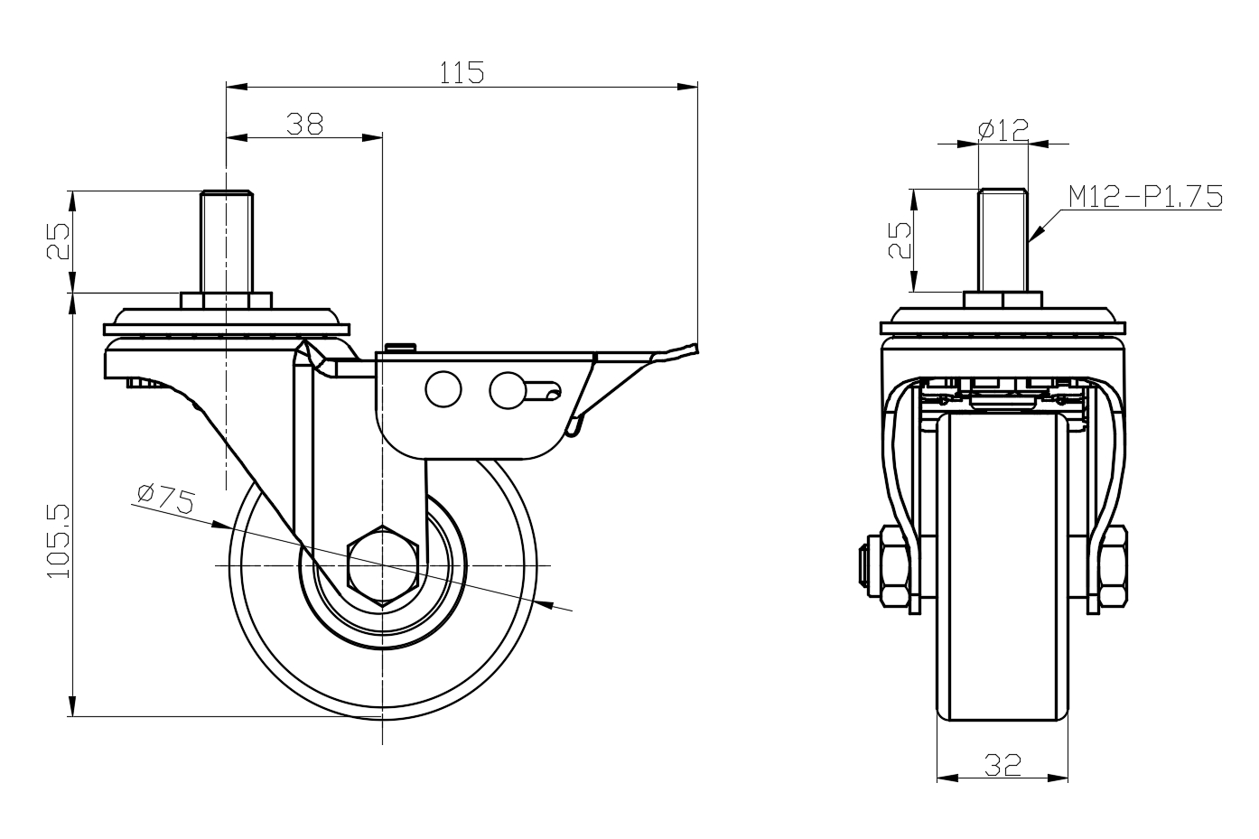 Casters with Total Brakes and a With locking system. Threaded Stem Riveted Pressed Fork—M12-P1.75.