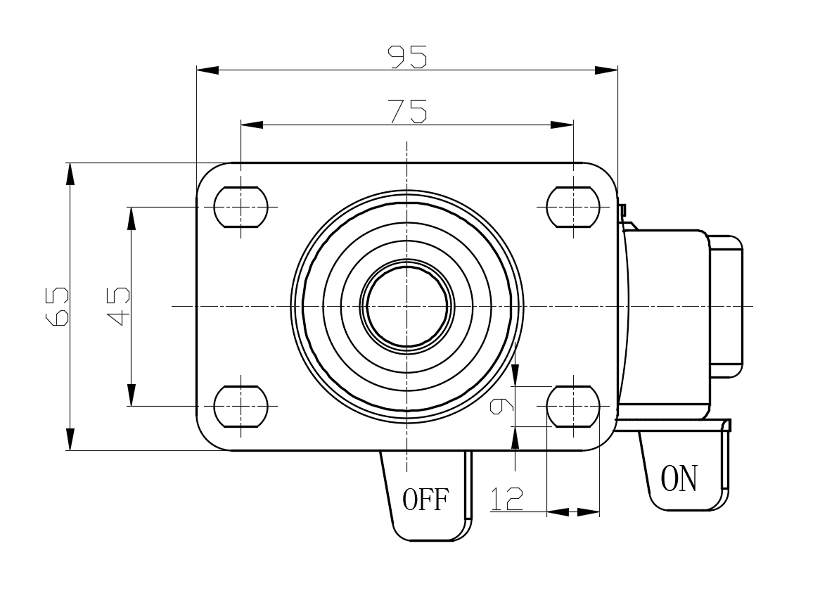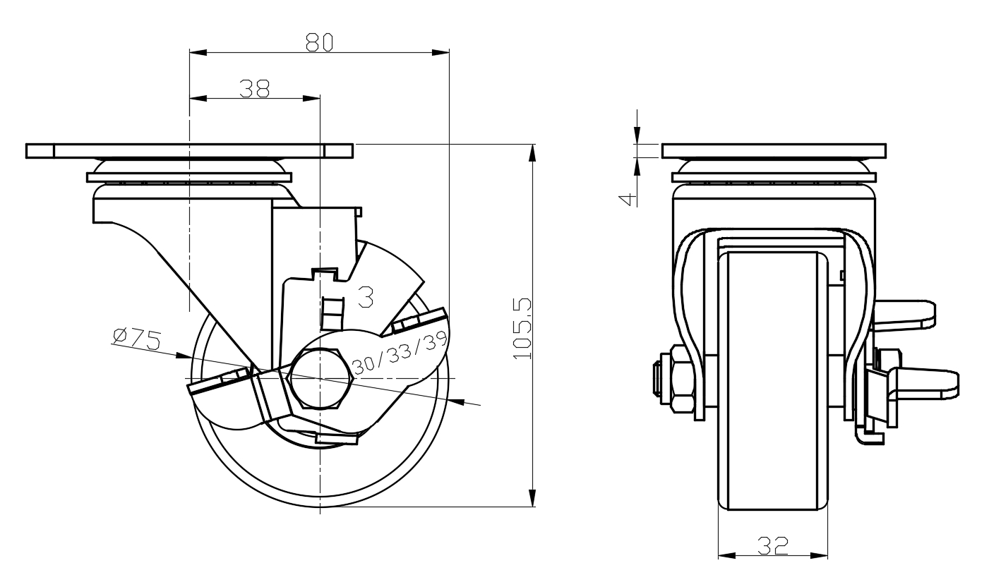 Casters with Side Brakes and With locking system. Top Plate Riveted and Fork – 75 x 45 mm (3" x 1-3/4") Bolt Hole Spacing.