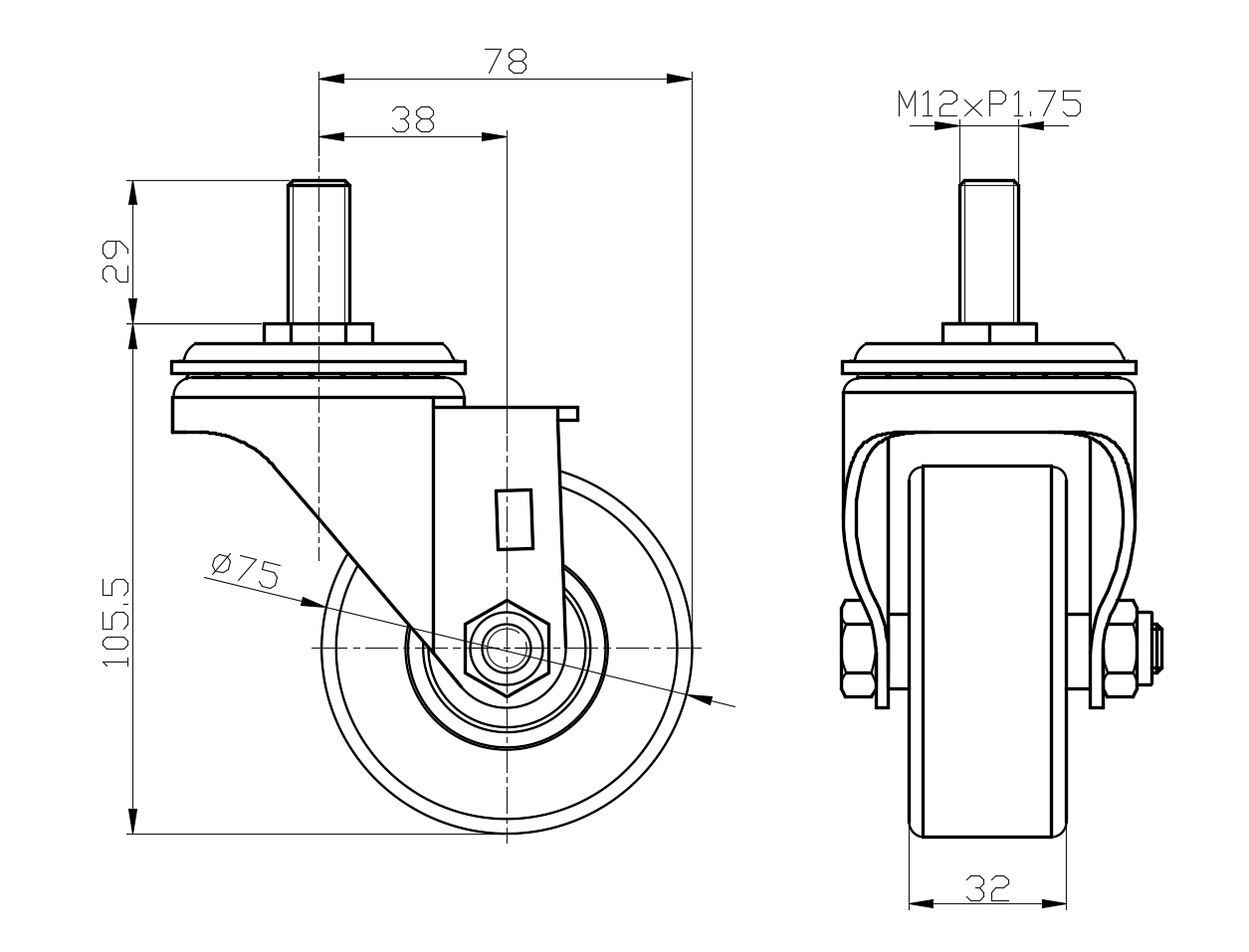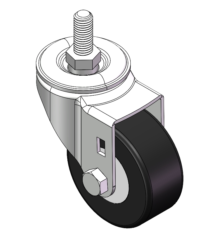 | Swivel Caster, thread-Riveted Stamping Fork—M12-P1.75 Extended control lever surface, Mounting Type - Threaded Stem device Cast Iron Wheel Center, High Quality Polyurethane Wheel Tread Black, Bearing—Ball Bearing. |