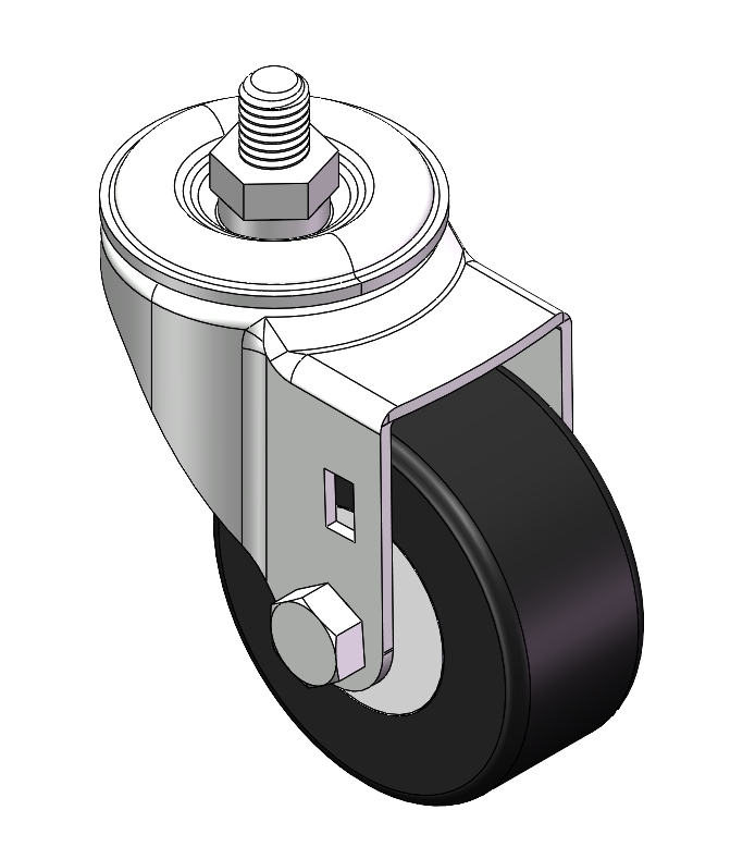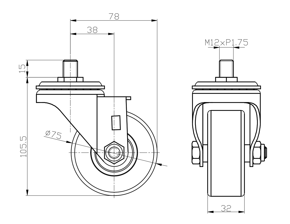 | Swivel Caster, thread-Riveted Stamping Fork—M12-P1.75 Extended control lever surface, Mounting Type - Threaded Stem device Cast Iron Wheel Center, High Quality Polyurethane Wheel Tread Black, Bearing—Ball Bearing. |