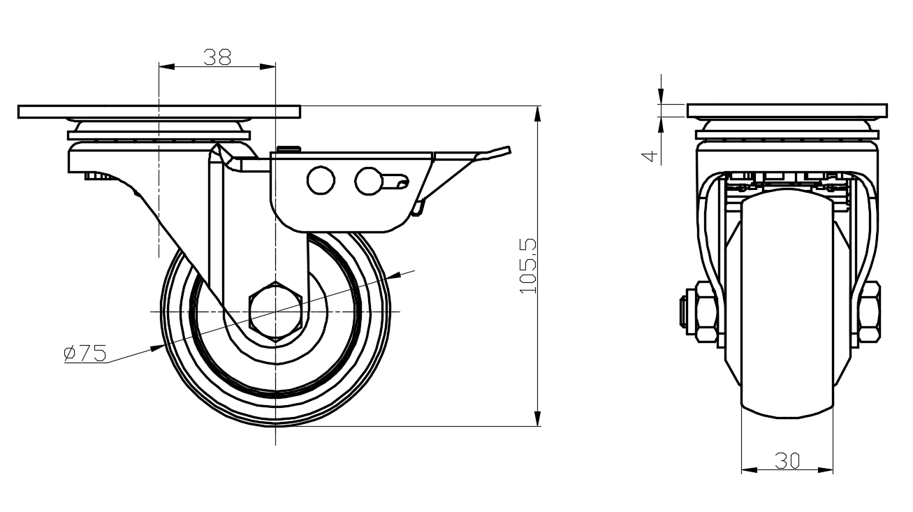 Casters with a Total Brake and With locking system. Top Plate with Riveted, Stamping Fork and 75 x 45 mm (3" x 1-3/4") Bolt Hole Spacing.