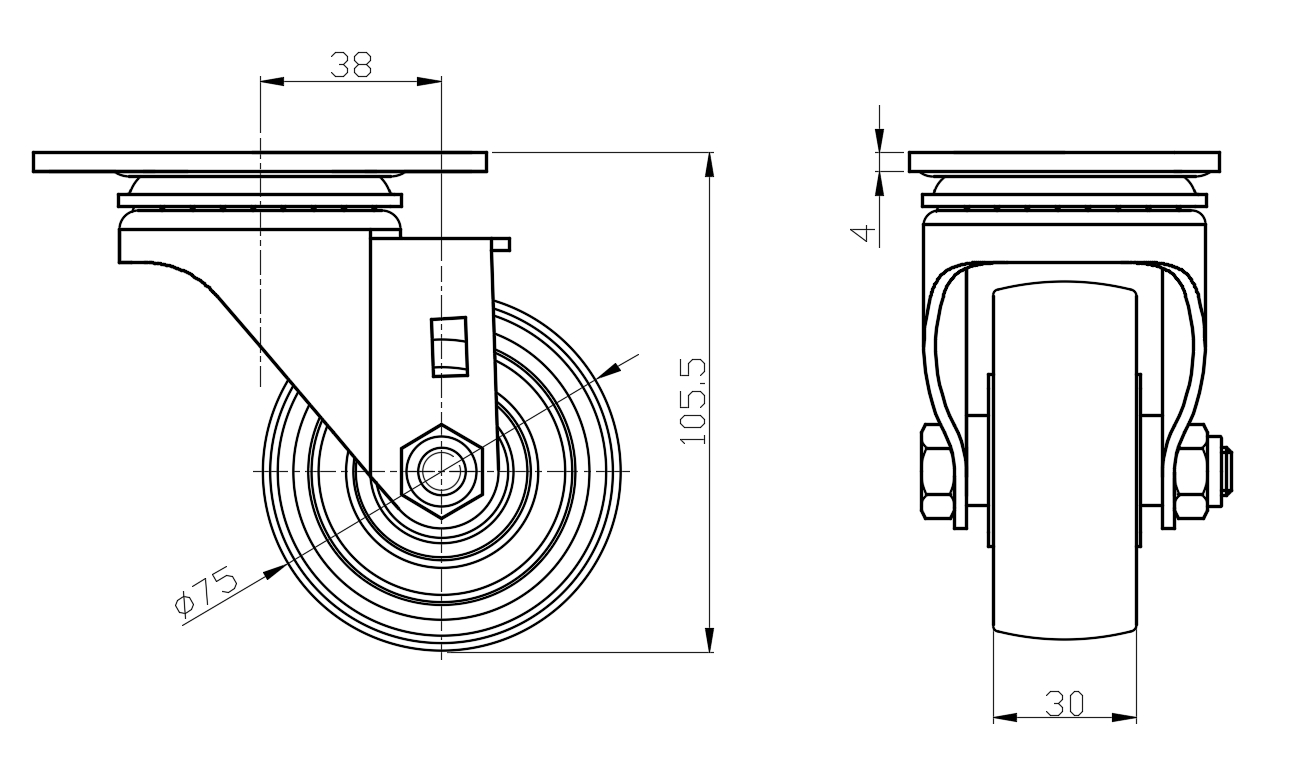 Swivel Caster with Riveted Fork and Stamping Fork—75 x 45 mm (3" x 1-3/4") Bolt Hole Spacing