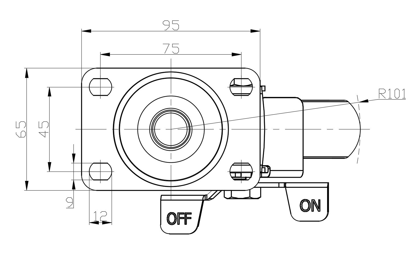 Casters with Side Brakes and With locking system. Top Plate Riveted and Fork – 75 x 45 mm (3" x 1-3/4") Bolt Hole Spacing.