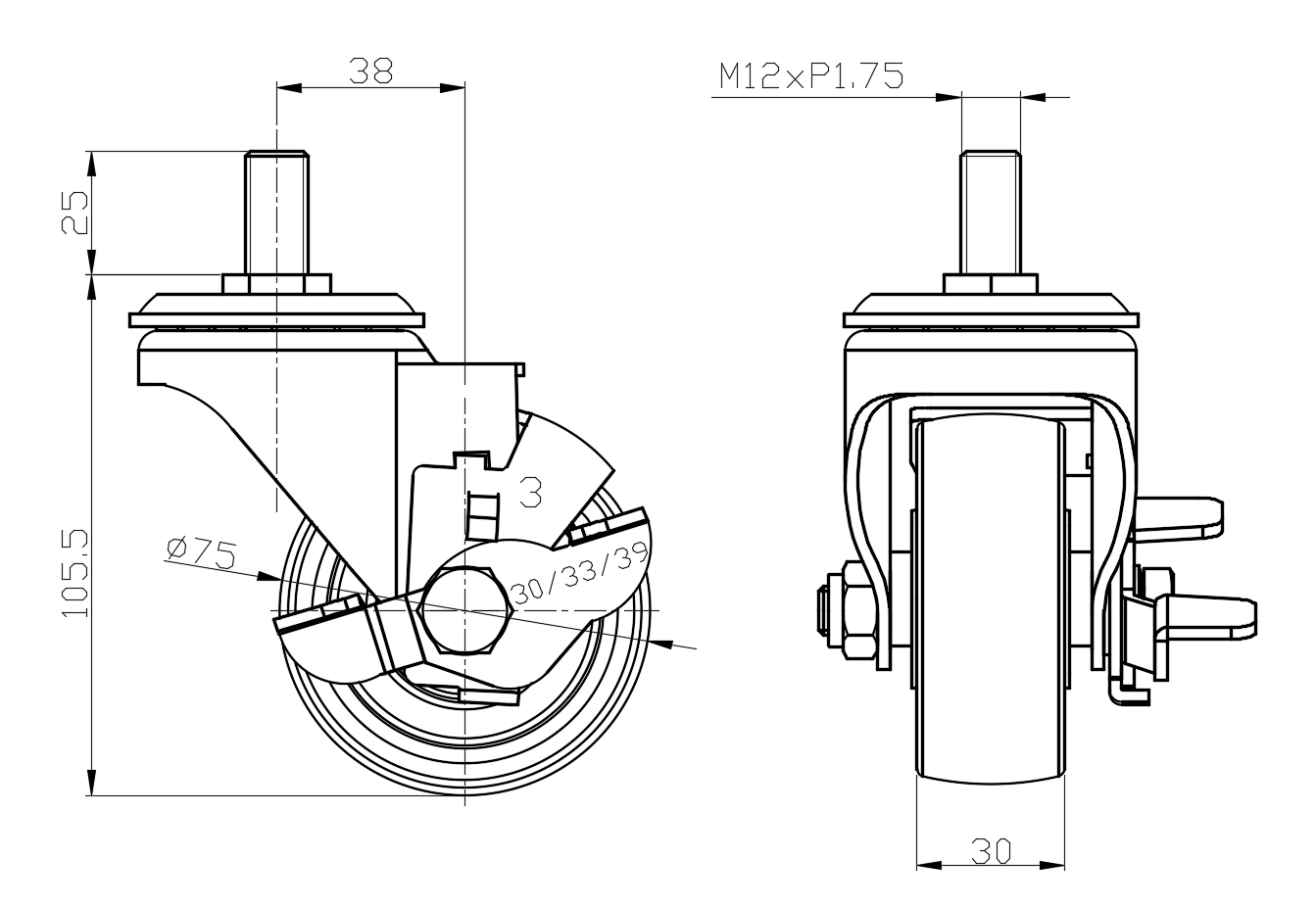 Casters with Side Brakes and With locking system. Threaded Stem Riveted Pressed Fork – M12-P1.75