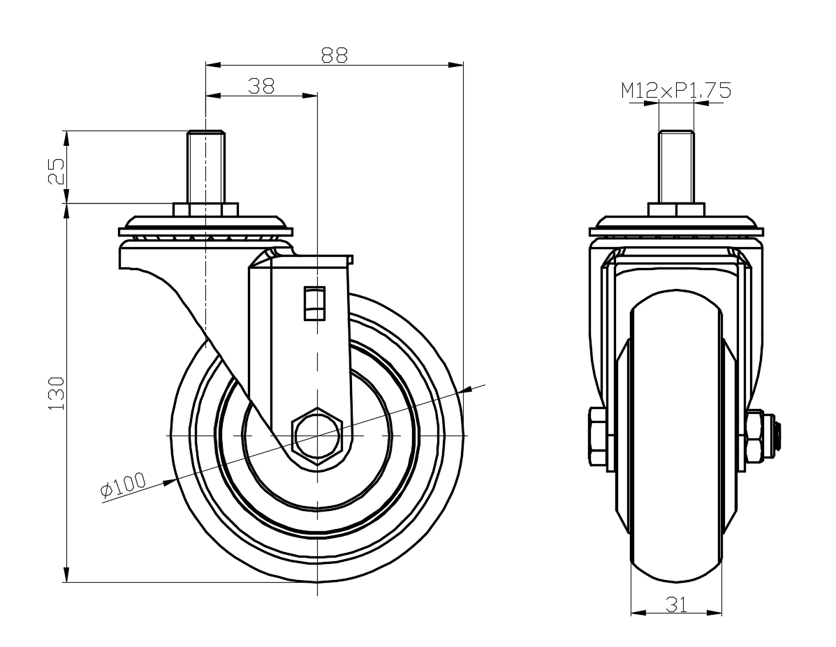 Swivel Caster, thread-Riveted Stamping Fork—M12-P1.75