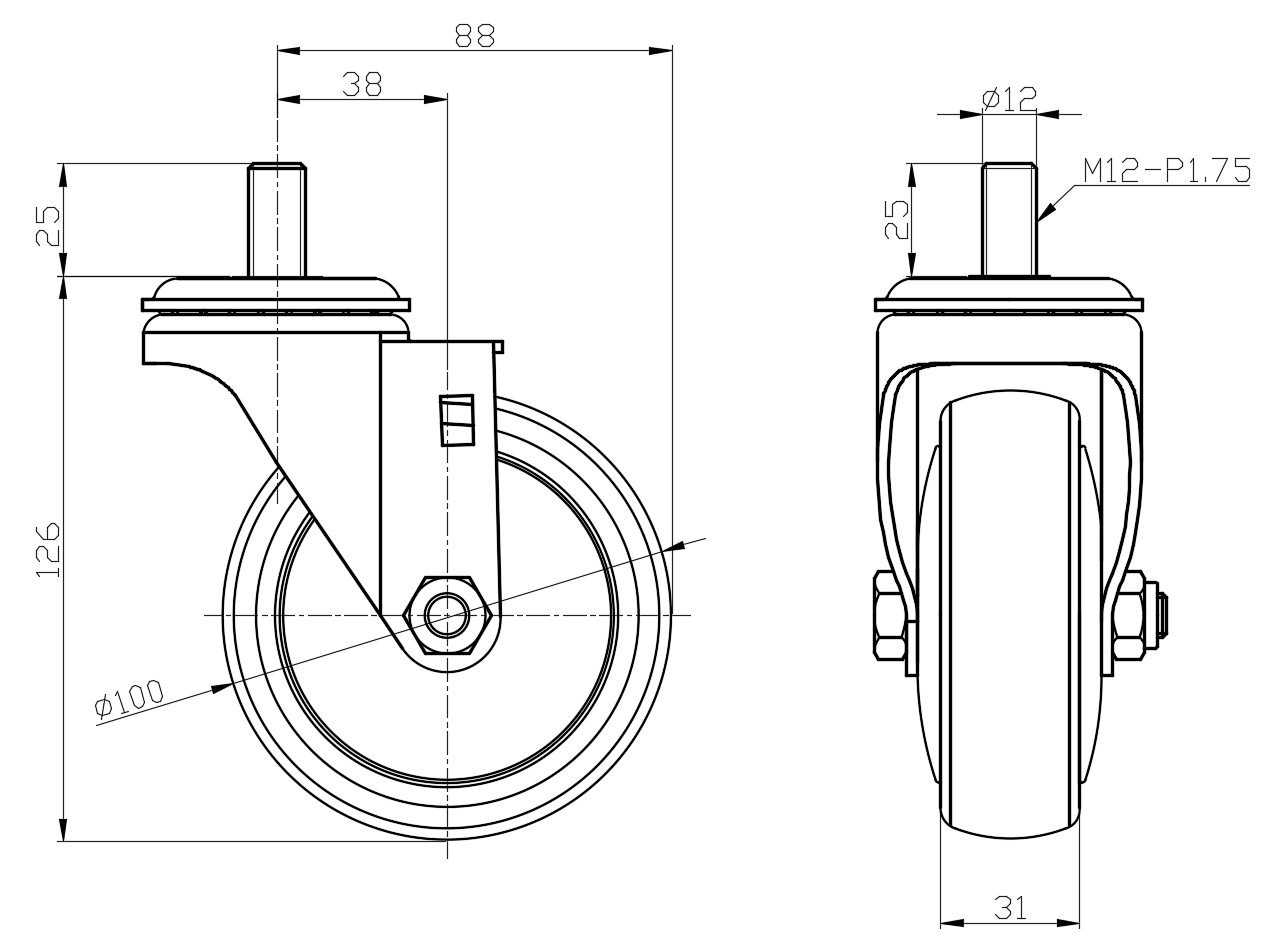 Swivel Caster with Riveted, Stamping Fork—M12-P1.75
