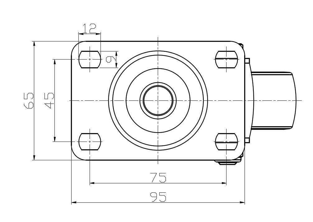Plate Size 95 x 65mm Bolt Hole Spacing 75 x 45mm Plate Hole 12 x 9mm Offset 38mm Swivel Interference 152mm Overall Height 105.5mm Swivel Radius 76mm Hardness Of Tread 65±5° Shore D Load Capacity (Dynamic) 100kgs |