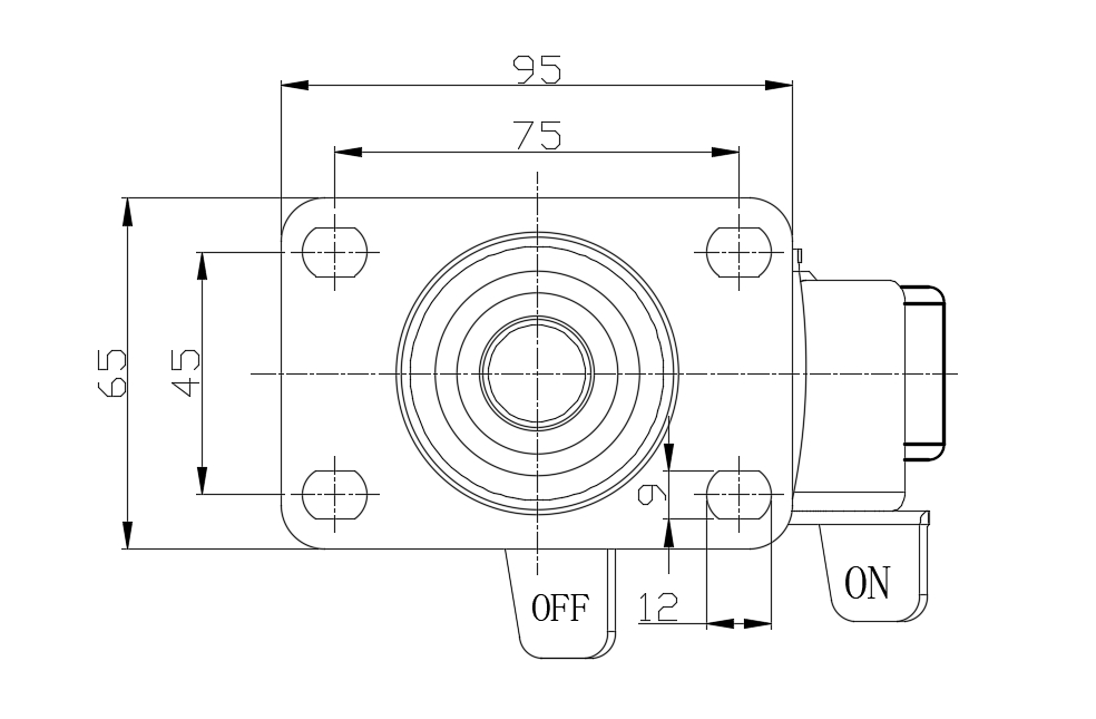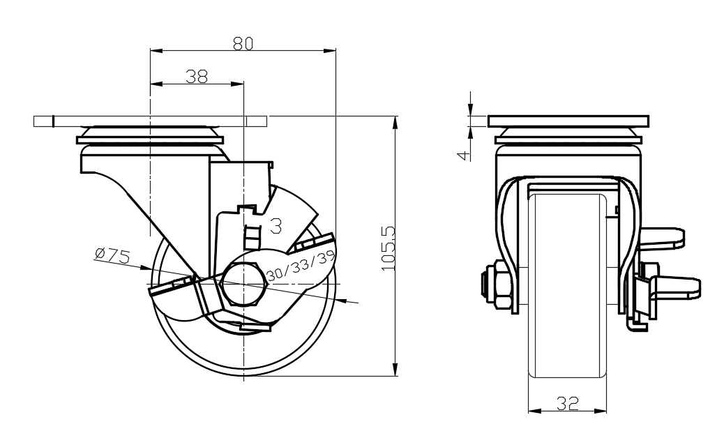 | Castors with Side Brake and Locking system. Top Plate Riveted Stamping Fork - 75 x 45 mm (3" x 1-3/4") Bolt Hole Spacing Extended control lever surface, Top Plate (4T) installation device Cast Iron Wheel Center, high quality polyurethane wheel tread Iron red, Bearing—Ball Bearing. |