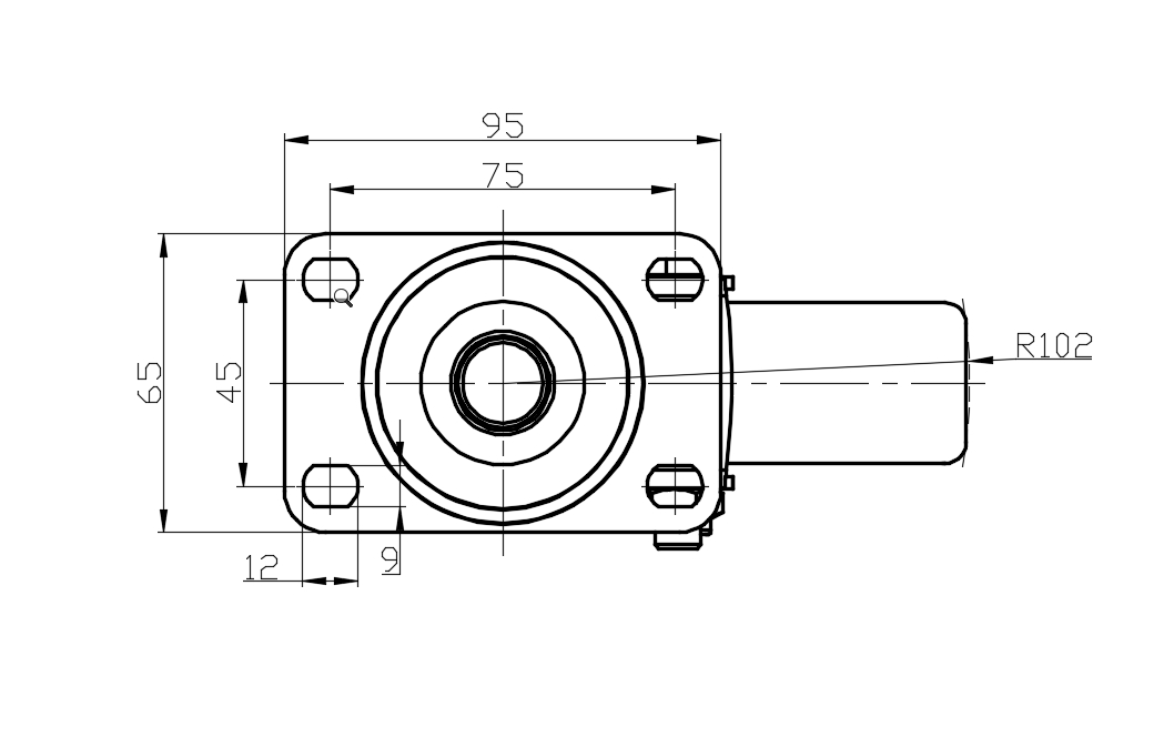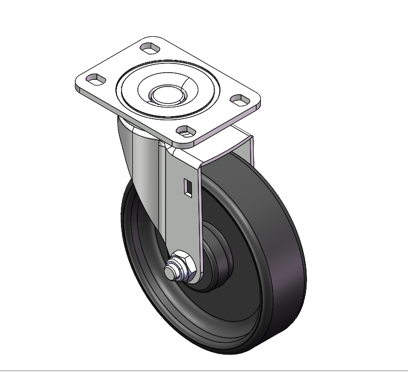 | Swivel Casters, Top Plate Riveted Fork - 75 x 45 mm (3" x 1-3/4") Bolt Hole Spacings Extended control lever surface, Top Plate (4T) installation device Polypropylene Wheel Center, Wheel Tread Black, wheels—Plain Bearing. |