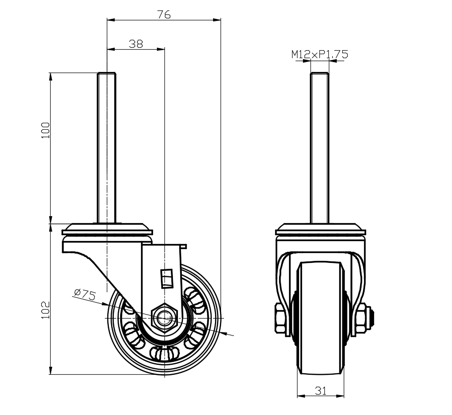 Portable Casters, Threaded Stem Stamping Fork—M12-P1.75