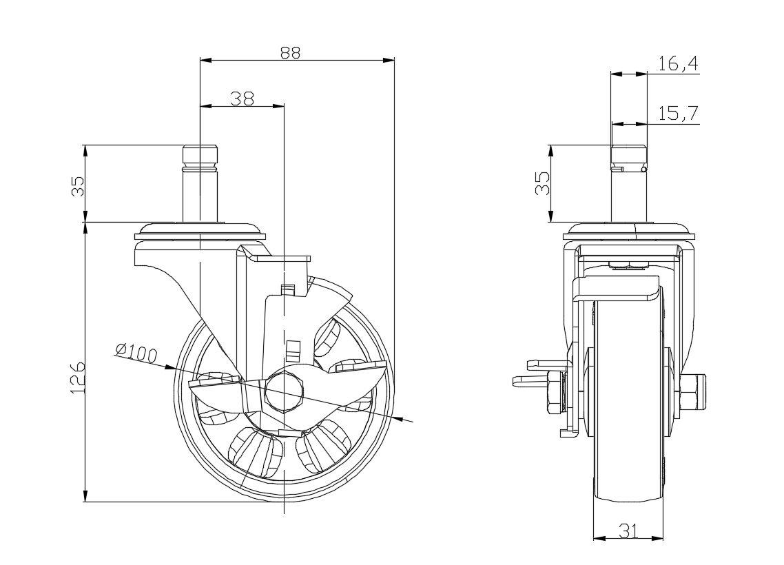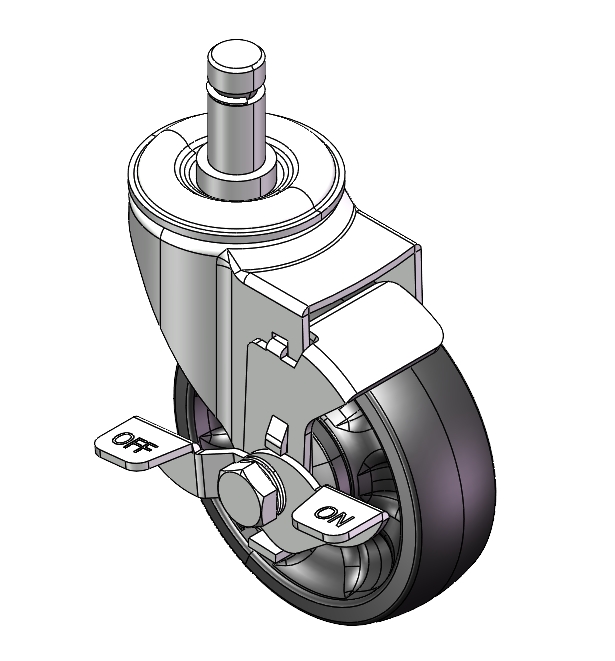 | Castors with Side Brakes and Locking system. Riveted Fork with plug-in rods —∅15.7 Surface Zine-Plated, plug-in rod Mounting Type device Polypropylene Wheel Center and Wheel Tread Black, Bearing — Ball Bearings. |