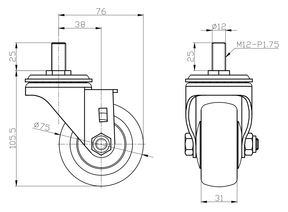 | Swivel Caster, thread Riveted Stamping Fork - M12-P1.75 Surface electroplating, Threaded Stem installation device High-quality Impact Resistance Polypropylene Wheel Center,High-Quality Thermoplastic Rubber (TPR) wheel tread Gray-dark grey, Bearing – Ball Bearing. |